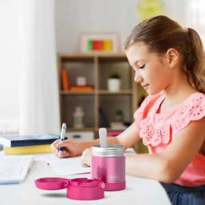 O frasco de alimentos FUNtainer de 10 onças da marca Thermos é isolado a vácuo para manter os alimentos quentes quentes e os frios frios – e, como foi projetado para crianças, também é colorido e divertido. Mande-os para a escola com a sopa caseira da mamãe para que possam saboreá-la fresca e quente na hora do almoço. Se eles estiverem com vontade de um lanche frio, embale-o com iogurte e frutas vermelhas ou maçãs e manteiga de amendoim. O pote de comida FunTainer é leve e compacto, com uma tampa de botão de pressão para que seja fácil de transportar e abrir. As crianças trabalham duro e, quando chega a hora do almoço, precisam de coisas saudáveis para aguentar o resto do dia. Este prático recipiente de comida para crianças tem uma boca larga, o que permite que elas engolam e engolam a comida diretamente da jarra de cores vivas. Para limpar, você pode colocar sua jarra de comida FUNtainer na máquina de lavar louça; no entanto, é recomendável lavar à mão. Colher incluída.