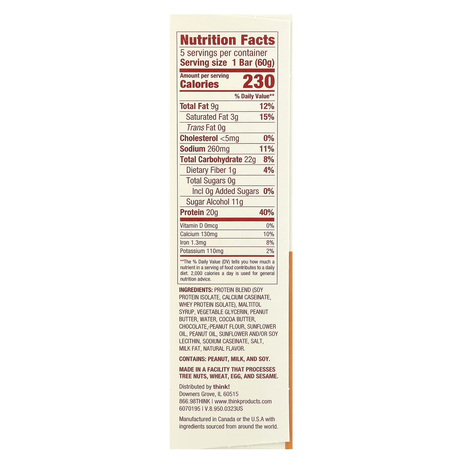 Think ! Barras com Alto Teor de Proteína Creamy Peanut Butter 5 Barras 60 g (21 oz) Cada – think! Nutrição Esportiva Barrinhas e snacks esportivos Barras de Proteína.