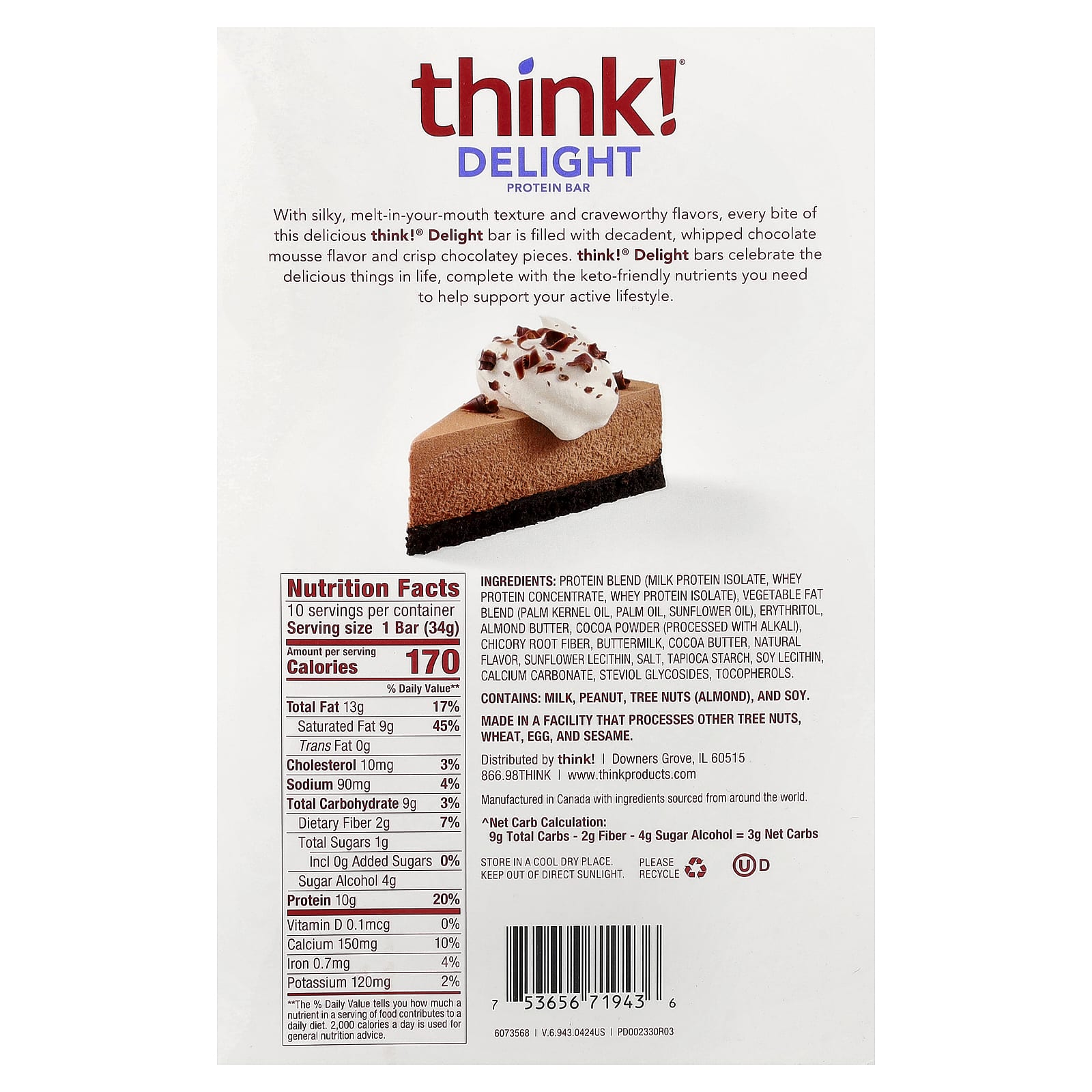 Com uma textura sedosa e que derrete na boca e sabores de dar água na boca, cada mordida desta deliciosa barra Delight think!® é repleta de um sabor clássico de mousse de chocolate batido e pedaços crocantes de chocolate. think!® As barras Delight celebram as coisas deliciosas da vida, sendo completas com os nutrientes compatíveis com a dieta cetogênica de que você precisa para manter seu estilo de vida ativo.