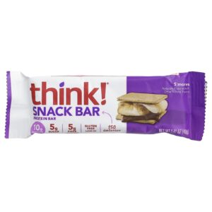 Pensamos: por que você não poderia obter um lanche nutritivo e delicioso para se manter saciado e satisfeito? É por isso que cada Barra de Proteína + 150 Calorias think!® tem o equilíbrio perfeito entre proteína e fibra com no máximo 5 g de açúcar em sabores deliciosos como S’mores. Recheada com sabores de biscoitos de Graham, marshmallow e chocolate, esta barra é uma maneira deliciosa de continuar seu dia.