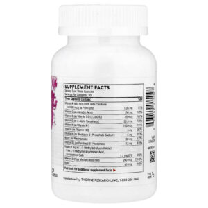 Os Centros de Controle e Prevenção de Doenças recomendam a suplementação de ácido fólico para todas as mulheres em idade fértil porque a maior necessidade é durante o primeiro trimestre, quando a mulher pode nem saber que está grávida. Mulheres que seguem uma dieta saudável que forneça folato adequado podem reduzir o risco de ter um filho com defeito de nascença no cérebro ou na medula espinhal. Um suplemento multivitamínico/multimineral de alta potência às vezes pode ser agressivo para o “estômago” da mulher, particularmente durante o primeiro trimestre de gravidez. Portanto, a Thorne não inclui grandes quantidades dos nutrientes comumente conhecidos por causar problemas estomacais. Em vez disso, pequenas quantidades desses nutrientes são incluídas, mas em suas formas mais absorvíveis e ideais para o contato com o tecido. Entre elas estão as formas ativas de várias vitaminas B, como fosfato de piridoxal (vitamina B6), fosfato de riboflavina (vitamina B2), L-5-MTHF (forma ativa de folato) e mecobalamina (vitamina B12 ). Como o cálcio em grandes quantidades também pode causar problemas estomacais, a Thorne usa uma quantidade moderada nas formas de citrato e malato altamente absorvíveis. Cálcio e magnésio adicionais podem ser suplementados conforme indicado.