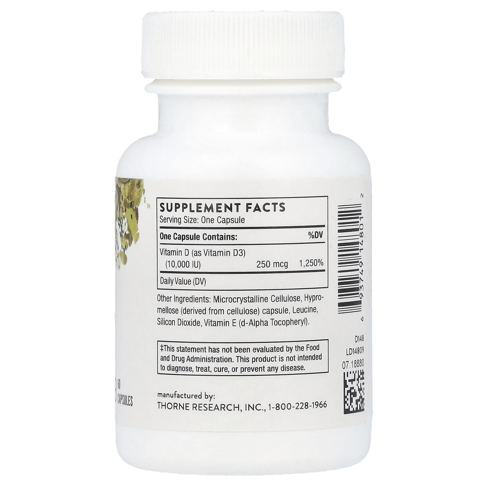 A vitamina D protege uma série de funções importantes no corpo. Além de promover ossos e músculos saudáveis, promove a saúde cardiovascular e a função imunológica. Embora a luz solar direta forneça vitamina D natural, muitos indivíduos de todas as idades, principalmente os idosos, não recebem vitamina D suficiente da luz solar e de sua dieta. A suplementação de vitamina D pode ser de grande benefício nessas situações. No entanto, os pós utilizados em muitas diluições pré-misturadas de vitamina D contêm frequentemente ingredientes potencialmente prejudiciais, como a lactose, bem como conservantes, como BHT, BHA, benzoato de sódio e ácido sórbico. A vitamina D da Thorne é formulada para indivíduos sensíveis a esses ingredientes.