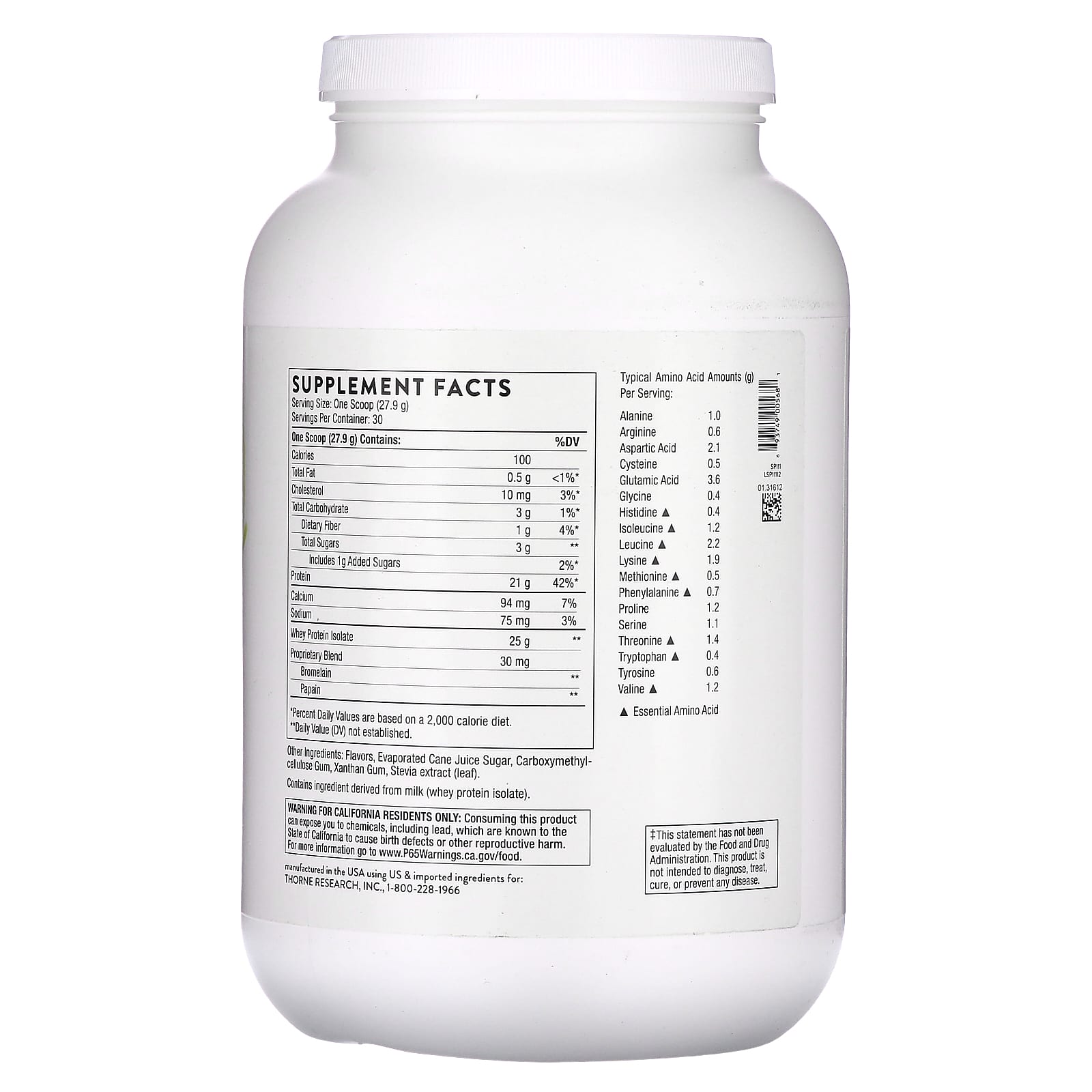 O Isolado de Proteína Whey contém aproximadamente 2,3 gramas por porção de leucina, um aminoácido que sinaliza aos músculos para se recuperarem e repararem após um treino. Pesquisas mostram que esta é a quantidade de leucina que melhor repara e mantém os músculos. O Isolado de Proteína Whey também fornece adição de bromelaína e papaína para sua atividade de protease – para ajudar na digestão de proteínas. Este produto da Thorne é adoçado com açúcar de cana evaporado e extrato de estévia, o que rende apenas dois gramas de açúcar por porção.