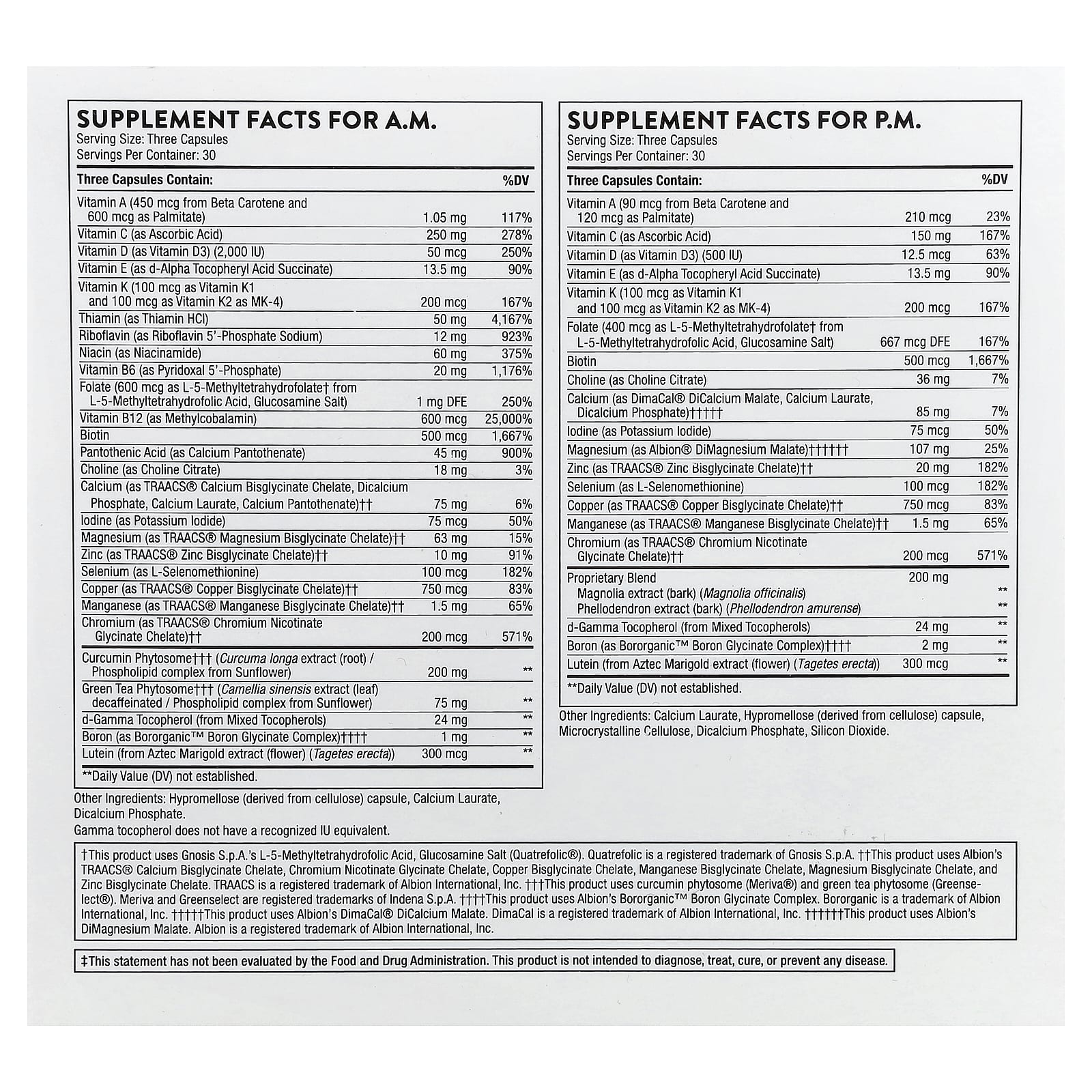 Tome 3 cápsulas da fórmula A.M. pela manhã e 3 cápsulas da fórmula P.M. à noite diariamente com uma refeição ou conforme recomendado pelo seu médico.