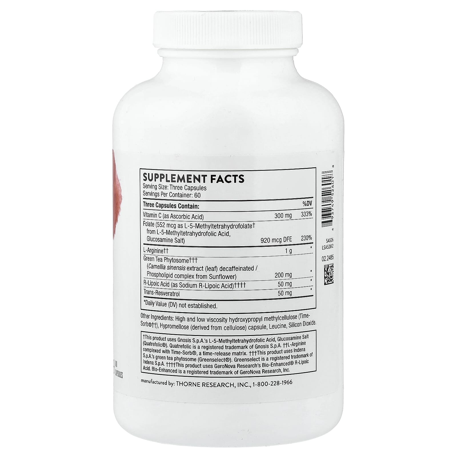 Pesquisas significativas corroboram os benefícios cardiovasculares da L-arginina na promoção da saúde vascular e do fluxo sanguíneo.* A L-arginina aumenta a produção de óxido nítrico nas artérias, o que, por sua vez, relaxa os vasos sanguíneos e mantém o fluxo sanguíneo saudável. A L-Arginine Plus da Thorne, com nutrientes para um reforço adicional, combina a L-arginina de liberação gradual com cofatores nutricionais que aumentam a síntese de óxido nítrico nos vasos sanguíneos (5-MTHF e ácido ascórbico), além de antioxidantes e plantas que promovem o fluxo sanguíneo normal (ácido R-lipoico, extrato de chá verde e resveratrol).*