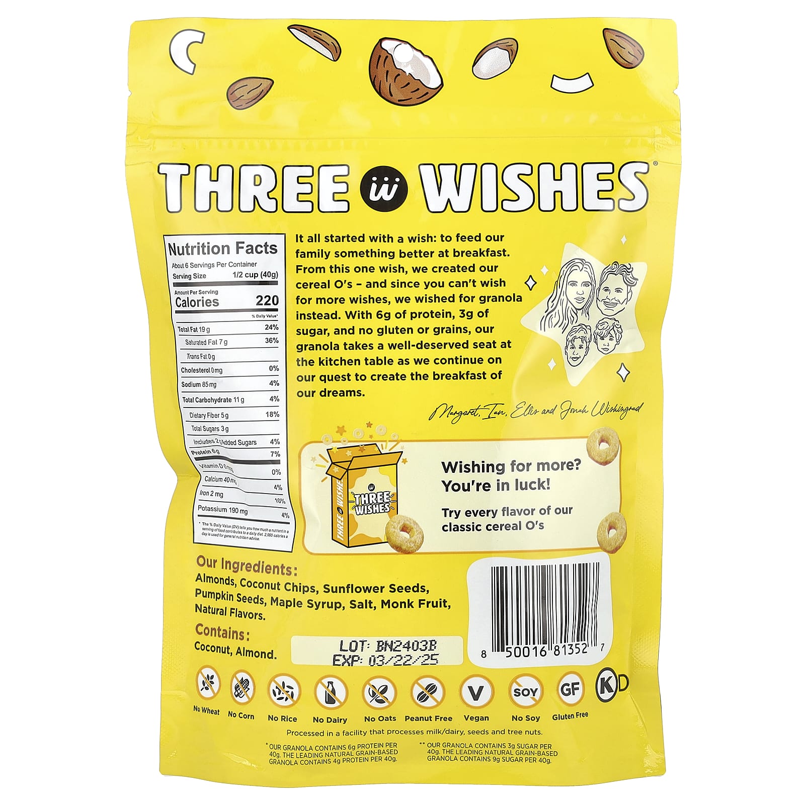 Tudo começou com um desejo: alimentar nossa família com algo melhor no café da manhã. A partir desse pedido, criamos nosso cereal O’s — e, como não se pode desejar mais desejos, nós desejamos granola. Com 6 g de proteína, 3 g de açúcar e sem glúten ou grãos, nossa granola tem um lugar merecido à mesa da cozinha, enquanto continuamos em nossa busca para elaborar o café da manhã dos nossos sonhos.
