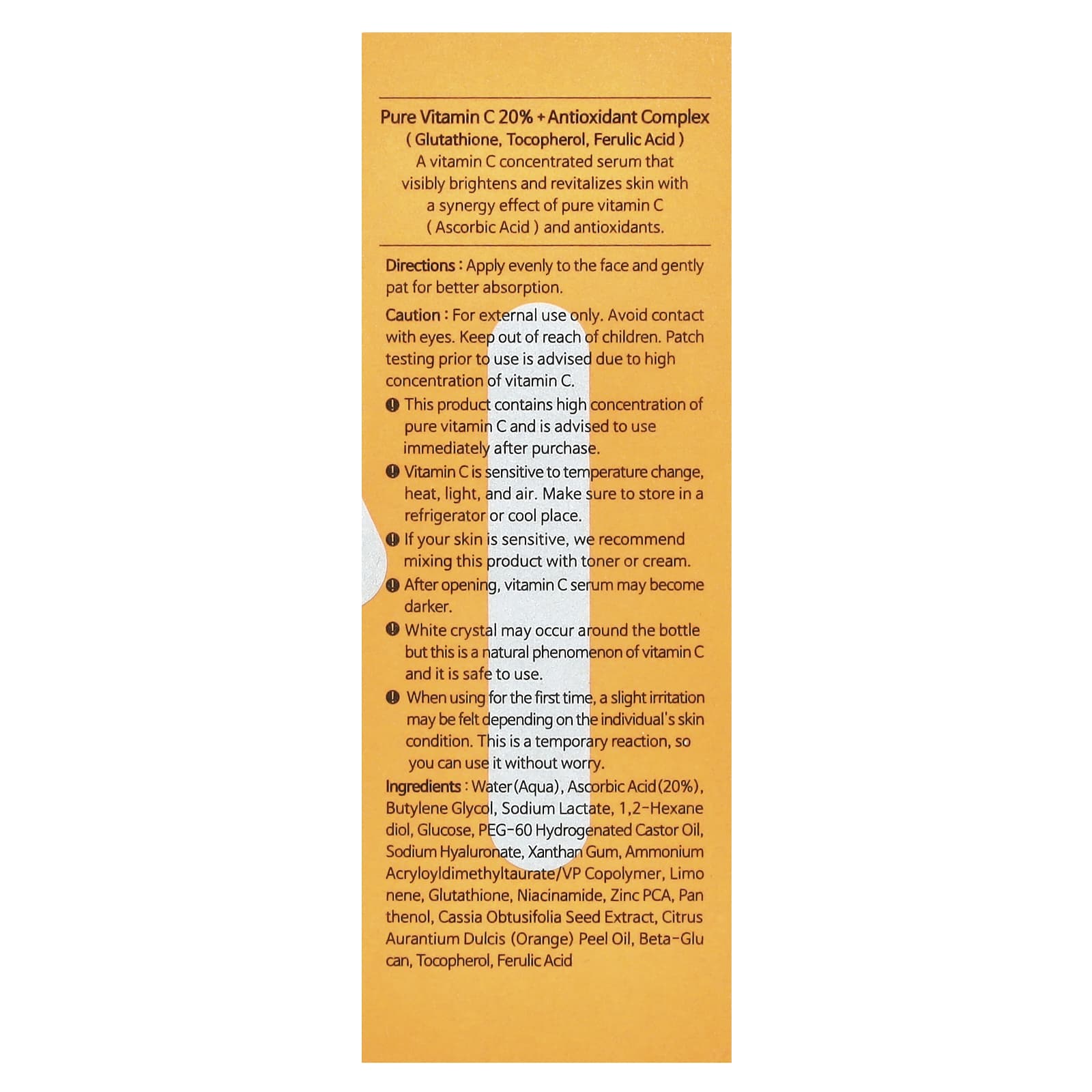 Água, ácido ascórbico (20%), butilenoglicol, lactato de sódio, 1,2-hexanediol, glicose, óleo de rícino hidrogenado peg-60, hialuronato de sódio, goma xantana, ammonium acryloyldimethyltaurate/vp copolymer, limoneno, glutationa, nicotinamida, zinco pca, pantenol, extrato da semente de Cassia obtusifolia, óleo da casca de Citrus aurantium dulcis (laranja), betaglucano, tocoferol, ácido ferúlico.