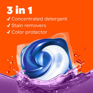Fórmula 3 em 1 Detergente, removedor de manchas e protetor de cores, tudo em uma cápsula.