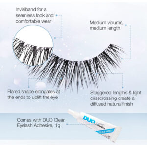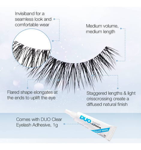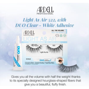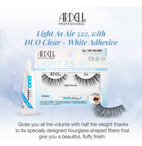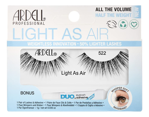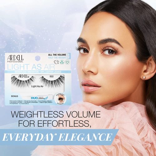 Light As Air 522 — Air-Light Dashing Lashes: cílios listrados excepcionalmente leves possibilitados por meio de uma tecnologia inovadora de cílios de fibra; ideais para uso diário e em qualquer ocasião; feitos com fios macios e extra confortáveis que oferecem um efeito de cílios mais real e espontâneo; não são rígidos com ou sem rímel; ótimos para looks casuais e elegantes; em parceria com a Ardells Incluvisband para facilitar e desobstruir Aplicação de cílios franzidos — fibras macias e afiadas: os cabelos são feitos com fibras perfeitamente macias e flexíveis para se misturarem facilmente com seus cabelos naturais; emitem cílios muito reais com efeito livre e descontraído; não ficam rígidos e permanecem enrolados com ou sem rímel — Comprimento e volume médios: pesam 50% menos do que os cílios listrados normais; melhoram a aparência dos olhos e da maquiagem sem adicionar muito peso; podem ser usados sozinhos ou com maquiagem pesada; muito confortáveis para os olhos e ótimos para uso prolongado — Experiência rápida e fácil com cílios: Feito com a Invisband, favorita de todos os tempos da Ardell, para uma aplicação simples e sem problemas nos cílios; faixas de cílios macias para ajustar o contorno da linha dos cílios; aplicação e remoção sem problemas; fáceis de limpar e reutilizar; ótimo para iniciantes e profissionais de cílios — economiza tempo e dinheiro: vem com 1 par de cílios e adesivo transparente confiável para cílios; não é necessário comprar separadamente e experimentar quais funcionam juntos; economiza tempo e dinheiro; embalagem cartonada feita com materiais 100% reciclados e impressa com tinta de soja;