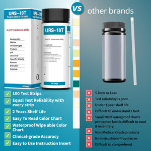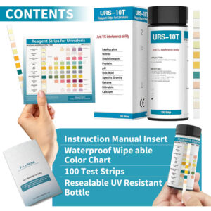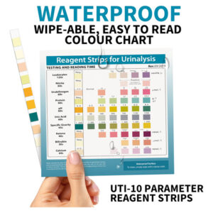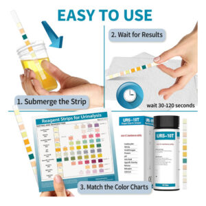 Are you looking for a comprehensive and reliable way to assess your urinary health? Look no further than our Urine Analysis Strip. With 10 parameters, this strip provides a thorough analysis of key indicators to help you monitor and understand your urinary system. Our strip tests for leukocytes, nitrite, urobilinogen, protein, pH, kidney function, specific gravity, ketones, bilirubin, and calcium. This wide range of parameters allows for a comprehensive evaluation of your urinary health, ensuring you have valuable insights into potential urinary tract infections (UTIs), kidney function, liver health, and more. With a long shelf life of up to 2 years, you can trust that our Urine Analysis Strip will deliver accurate results whenever you need it. The rapid testing feature allows for quick and efficient assessment, providing you with timely information for informed decision-making. Each bottle contains 100 strips, ensuring an ample supply for multiple testing sessions. The generous quantity makes it convenient for regular monitoring or sharing with family members or healthcare professionals. Our Urine Analysis Strip is designed for convenience, reliability, and accuracy. Trust in its high quality and dependable readings to gain valuable insights into your urinary health. Monitor your urinary system with confidence using our Urine Analysis Strip – 10 Parameter. Take control of your health today! – COMPREHENSIVE ANALYSIS: Detects and measures 10 key parameters including leukocytes, nitrite, urobilinogen, protein, pH, kidney function , specific gravity, ketones, bilirubin, and calcium in urine for a thorough assessment of overall health and wellness. – EARLY DETECTION: Enables early identification of potential urinary tract infections (UTIs), kidney disorders, liver dysfunction, and other urinary system abnormalities through the analysis of leukocytes, nitrite, and urobilinogen levels. – PROTEIN & pH MONITORING: Helps monitor kidney function and assess urine acid-alkaline balance with accurate measurements of protein levels and pH. – SPECIFIC GRAVITY & KETONE MONITORING: Measures specific gravity to evaluate hydration levels and assess kidney function. Additionally, detects ketones in urine, providing valuable information for individuals following ketogenic diets. – EXTENDED SHELF LIFE: The urine analysis strip has a long shelf life of up to 2 years, ensuring that you can confidently use it within the specified timeframe without concerns about expiration. – RAPID RESULTS: Experience quick and efficient testing with rapid results provided by the urine analysis strip. Obtain accurate readings within minutes, allowing for timely assessment and decision-making.