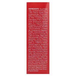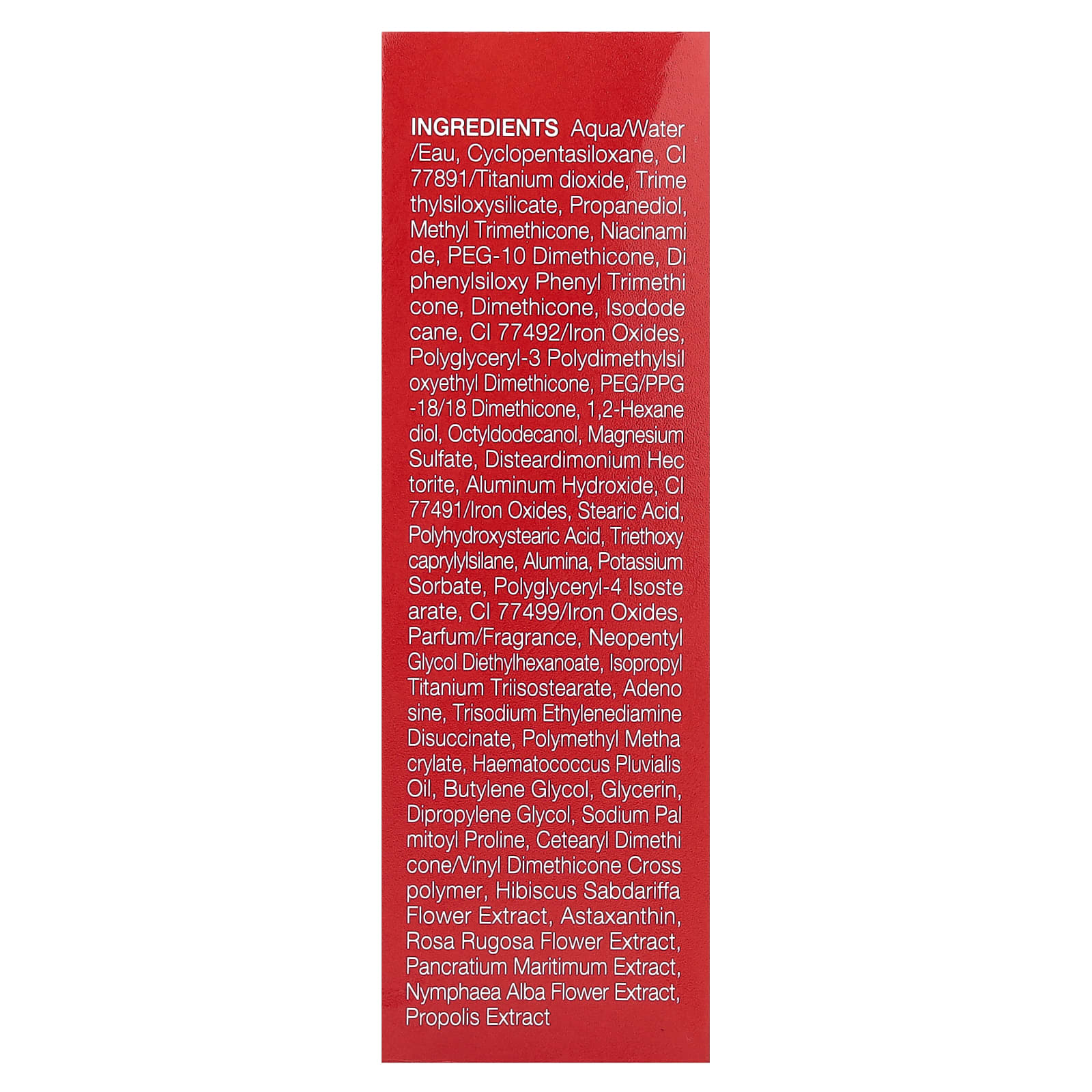 Água/aqua/eau, ciclopentasiloxano, Cl 77891/dióxido de titânio, trimethylsiloxysilicate, propanediol, methyl trimethicone, nicotinamida, peg-10 dimeticona, diphenylsiloxy phenyl trimethicone, dimeticona, isododecane, CI 77492/óxidos de ferro, polyglyceryl-3 polydimethylsiloxyethyl dimethicone, peg/ppg -18/18 de dimeticona, 1,2-hexanediol, octildodecanol, sulfato de magnésio, disteardimonium hectorite, hidróxido de alumínio, CI 77491/óxidos de ferro, ácido esteárico, ácido polihidroxiesteárico, triethoxycaprylylsilane, alumina, sorbato de potássio, polyglyceryl-4 isostearate, CI 77499/óxidos de ferro, perfume/fragrância, neopentyl glycol diethylhexanoate, isopropyl titanium triisostearate, adenosina, trisodium ethylenediamine disuccinate, polymethyl methacrylate, óleo de Haematococcus pluvialis, butilenoglicol, glicerina, dimetildietilenoglicol, prolina palmitoil sódio, crospolímero de cetoestearílico de dimeticona/vinil dimeticona, extrato da flor de Hibiscus sabdariffa, astaxantina, extrato da flor de Rosa rugosa, extrato de Pancratium maritimum, extrato da flor de Nymphaea alba, extrato de própolis.