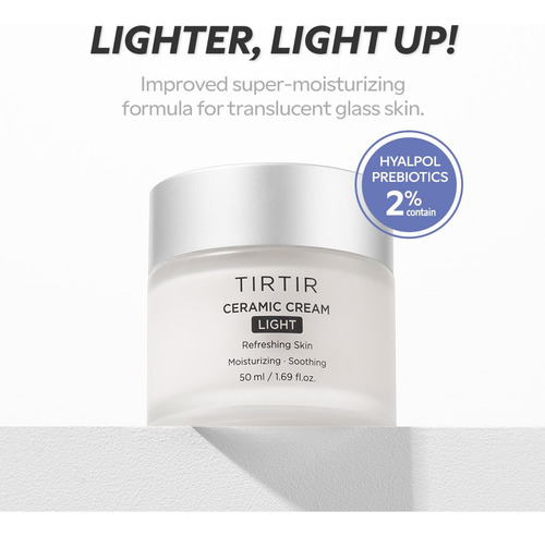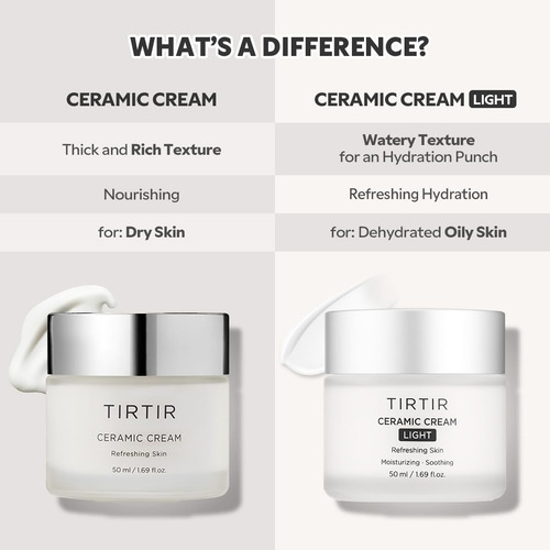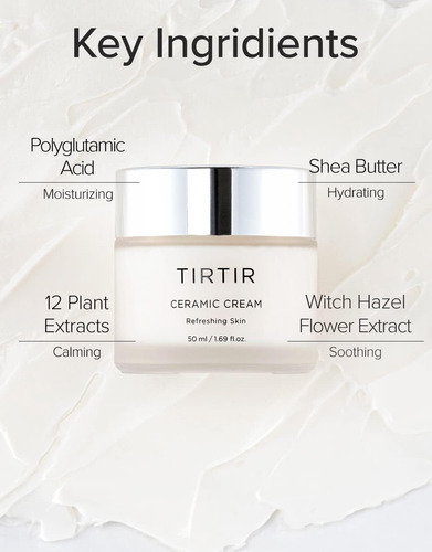 SUAVE NA PELE Sem óleo mineral, sem fragrância, sem parabenos e hipoalergênico. Este creme é adequado para sua rotina diária de cuidados com a pele. É excelente em fornecer hidratação, especialmente à noite, quando aplicado generosamente antes de dormir. O creme cerâmico TIRTIR é a melhor escolha para células de pele profundamente hidratadas, menos mortas e uma tez brilhante.