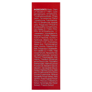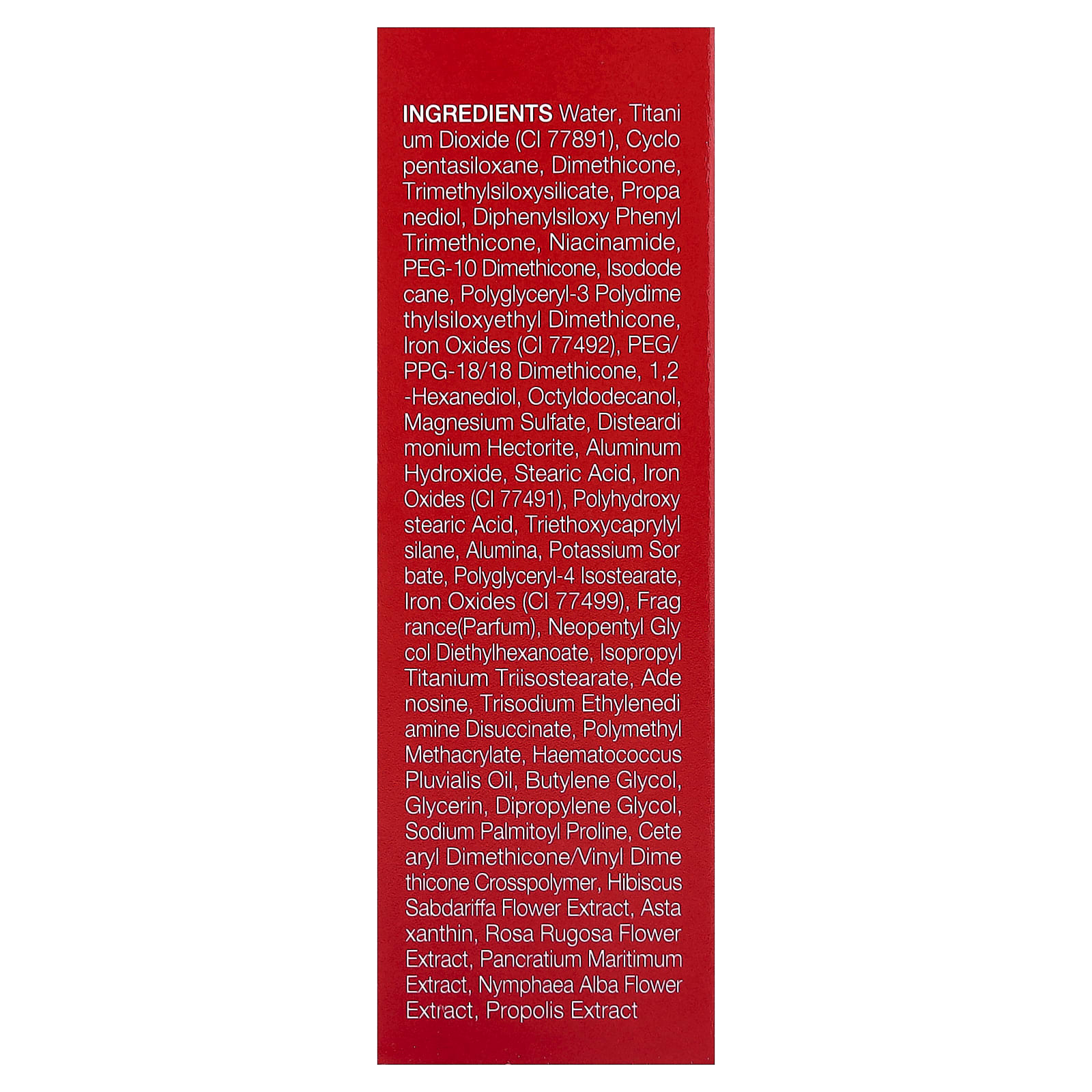Água, dióxido de titânio (CI 77891), ciclopentasiloxano, dimeticona, trimethylsiloxysilicate, propanediol, diphenylsiloxy phenyl trimethicone, nicotinamida, peg-10 dimeticona, isododecane, polyglyceryl-3 polydimethylsiloxyethyl dimethicone, óxidos de ferro (CI 77492), peg/ppg-18/18 dimeticona, 1,2-hexanediol, octildodecanol, sulfato de magnésio, disteardimonium hectorite, hidróxido de alumínio, ácido esteárico, óxidos de ferro (CI 77491), ácido esteárico polihidroxi, triethoxycaprylylsilane, alumina, sorbato de potássio, polyglyceryl-4 isostearate, óxidos de ferro (CI 77499), fragrância (perfume), neopentyl glycol diethylhexanoate, isopropyl titanium triisostearate, adenosina, trisodium ethylenediamine disuccinate, polymethyl methacrylate, óleo de Haematococcus pluvialis, butilenoglicol, glicerina, dimetildietilenoglicol, prolina palmitoil sódio, crospolímero de cetoestearílico de dimeticona/vinil dimeticona, extrato da flor de Hibiscus sabdariffa, astaxantina, extrato da flor de Rosa rugosa, extrato de Pancratium maritimum, extrato da flor de Nymphaea alba, extrato de própolis.
