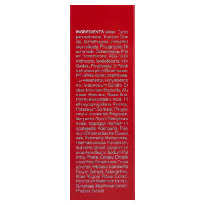 Água, decametilciclopentasiloxano, dióxido de titânio, dimeticona, trimethylsiloxysilicate, propanediol, nicotinamida, diphenylsiloxy phenyl trimethicone, peg-10 di methicone, isododecane, óxidos de ferro, polyglyceryl-3 polydimethylsiloxyethyl dimethicone, peg/ppg-18/18 dimeticona, 1,2-hexanediol, octildodecanol, sulfato de magnésio, disteardimonium hectorite, hidróxido de alumínio, ácido esteárico, ácido polihidroxiesteárico, triethoxycaprylylsilane, alumina, sorbato de potássio, polyglyceryl-4 isostearate, fragrância, neopentyl glycol diethylhexanoate, tri-isoestearato de titânio de isopropila, adenosina, trisodium ethylenediamine disuccinate, polymethyl methacrylate, óleo de Haematococcus pluvialis, butilenoglicol, glicerina, dipropilenoglicol, prolina palmitoil sódio, polímero cruzado de cetearil dimeticona/vinil dimeticona, extrato da flor de Hibiscus sabdariffa, astaxantina, extrato da flor de Rosa rugosa, extrato de Pancratium maritimum, extrato da flor de Nymphaea alba, extrato de própolis.