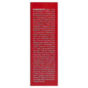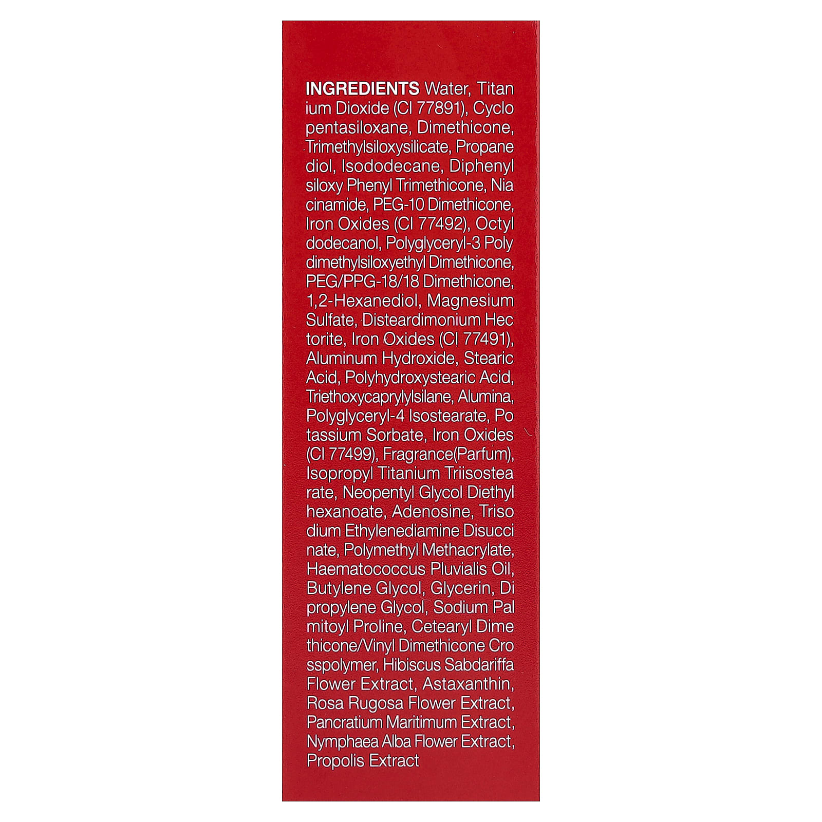 Água, dióxido de titânio (CI 77891), ciclopentasiloxano, dimeticona, trimethylsiloxysilicate, propanediol, isododecane, diphenylsiloxy phenyl trimethicone, nicotinamida, peg-10 dimeticona, óxidos de ferro (CI 77492), octil dodecanol, polyglyceryl-3 polydimethylsiloxyethyl dimethicone, peg/ppg-18/18 dimeticona, 1,2-hexanediol, sulfato de magnésio, disteardimonium hectorite, óxidos de ferro (CI 77491), hidróxido de alumínio, ácido esteárico, ácido polihidroxiesteárico, triethoxycaprylylsilane, alumina, polyglyceryl-4 isostearate, sorbato de potássio, óxidos de ferro (CI 77499), fragrância (perfume), isopropyl titanium triisostearate, neopentyl glycol diethylhexanoate, adenosina, trisodium ethylenediamine disuccinate, polymethyl methacrylate, óleo de Haematococcus pluvialis, butilenoglicol, glicerina, dimetildietilenoglicol, prolina palmitoil sódio, crospolímero de cetoestearílico de dimeticona/vinil dimeticona, extrato da flor de Hibiscus sabdariffa, astaxantina, extrato da flor de Rosa rugosa, extrato de Pancratium maritimum, extrato da flor de Nymphaea alba, extrato de própolis.