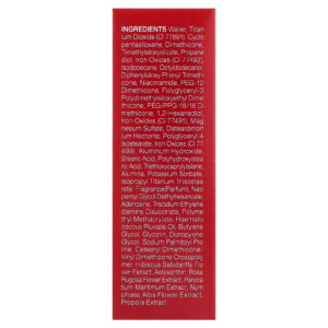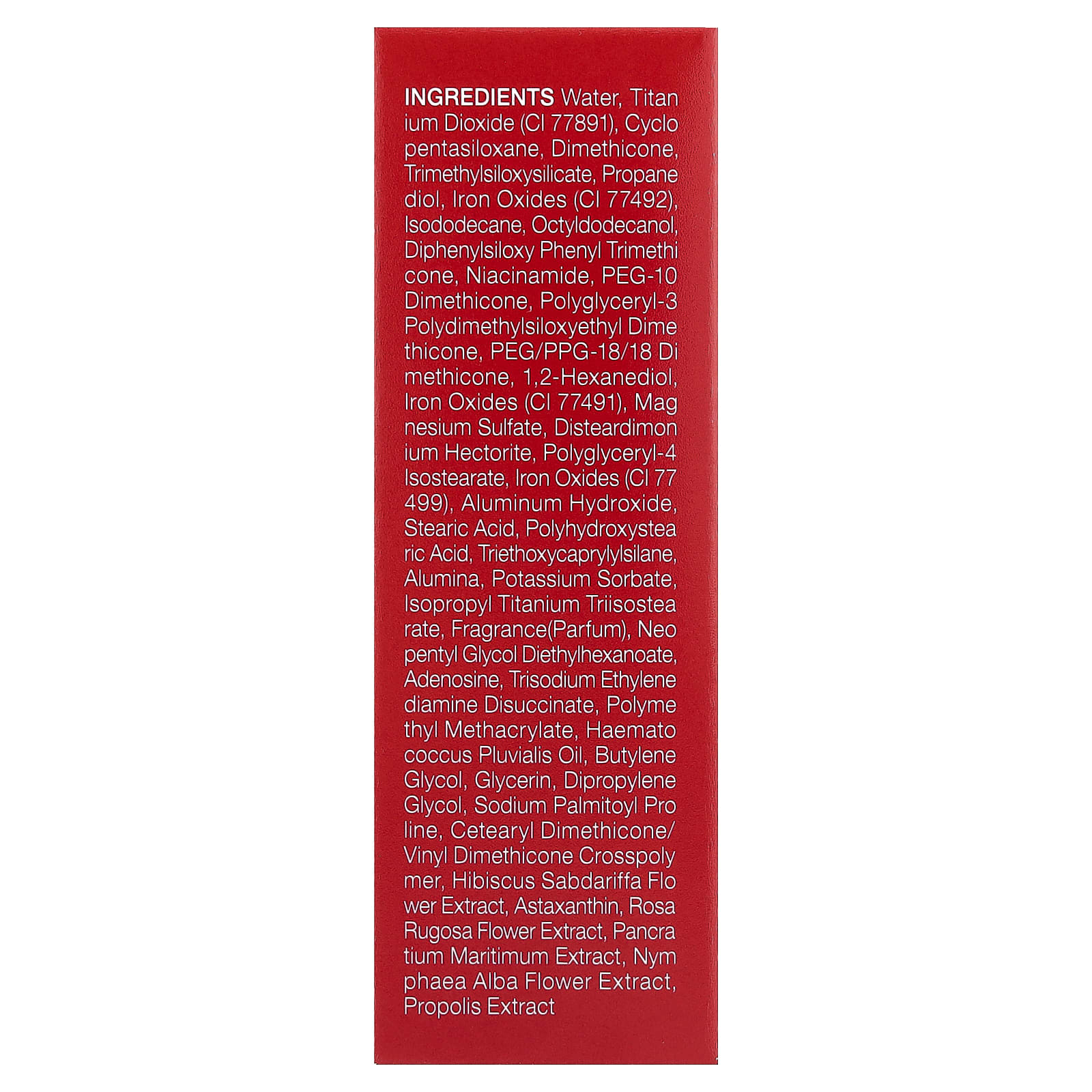 Água, dióxido de titânio (CI 77891), ciclopentasiloxano, dimeticona, trimethylsiloxysilicate, propanediol, óxidos de ferro (CI 77492) isododecano, octildodecanol, diphenylsiloxy phenyl trimethicone, nicotinamida, peg-10 dimeticona, polyglyceryl-3 polydimethylsiloxyethyl dimethicone, peg/ppg-18/18 di methicone, 1,2-hexanediol, óxidos de ferro (CI 77491), sulfato de magnésio, disteardimonium hectorite, polyglyceryl-4 isostearate, óxidos de ferro (CI 77 499), hidróxido de alumínio, ácido esteárico, ácido polihidroxiesteárico, triethoxycaprylylsilane, alumina, sorbato de potássio, isopropyl titanium triisostearate, fragrância (perfume), neopentyl glycol diethylhexanoate, adenosina, disuccinato de etileno diamina trissódica, polymethyl methacrylate, óleo de Haemato coccus pluvialis, butilenoglicol, glicerina, dimetildietilenoglicol, prolina palmitoil sódio, crospolímero de cetoestearílico/dimeticona de vinil, extrato da flor de Hibiscus sabdariffa, astaxantina, extrato da flor de Rosa rugosa, extrato de Pancratium maritimum, extrato da flor de Nymphaea alba, extrato de própolis.