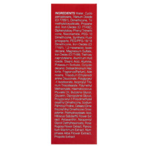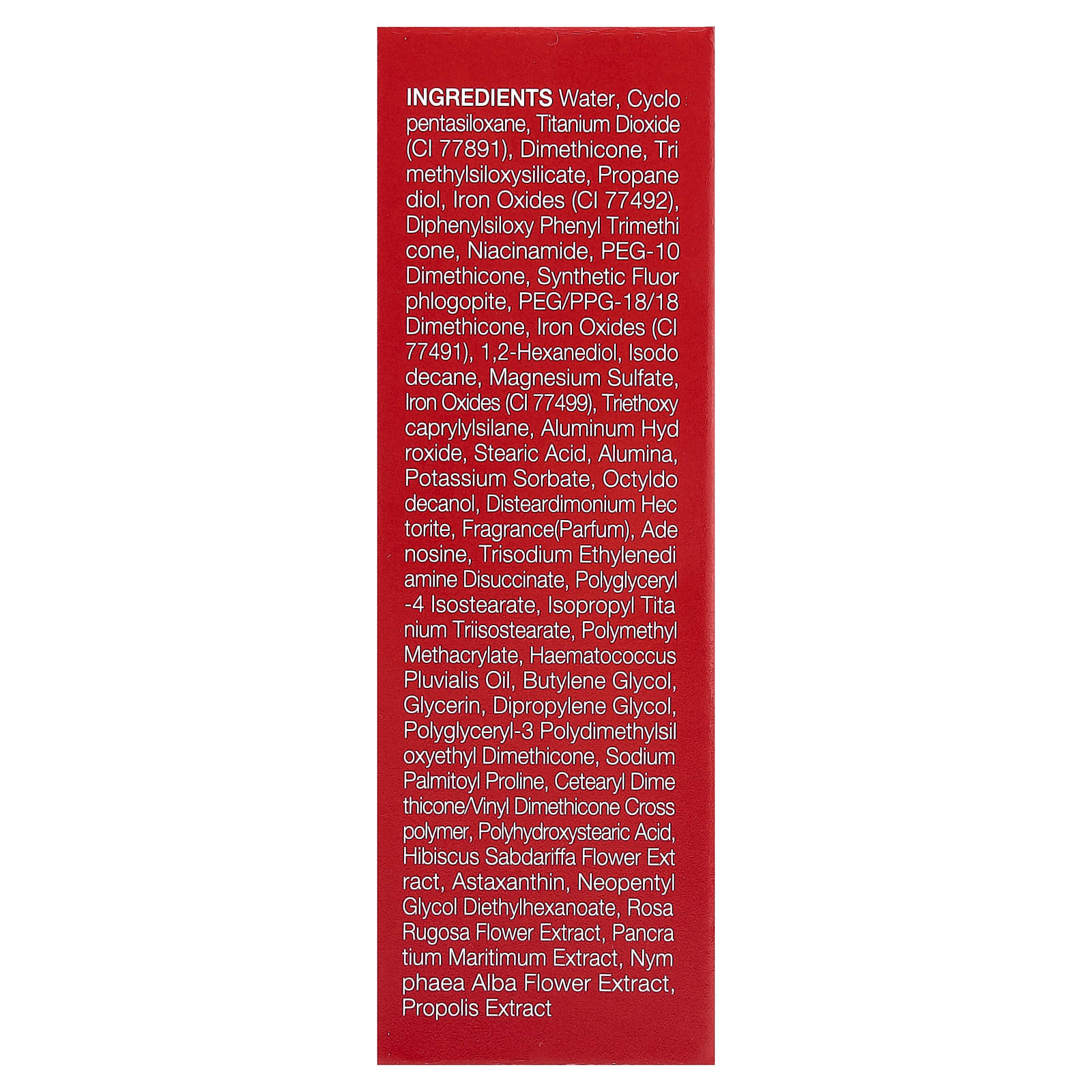 Água, ciclopentasiloxano, dióxido de titânio (CI 77891), dimeticona, trimethylsiloxysilicate, propanediol, óxidos de ferro (CI 77492), diphenylsiloxy phenyl trimethicone, nicotinamida, peg-10 dimeticona, synthetic fluorphlogopite, peg/ppg-18/18 dimeticona, óxidos de ferro (CI 77491), 1,2-hexanediol, isododecane, sulfato de magnésio, óxidos de ferro (CI 77499), triethoxycaprylylsilane, hidróxido de alumínio, ácido esteárico, alumina, sorbato de potássio, octildodecanol, disteardimonium hectorite, fragrância (perfume), adenosina, trisodium ethylenediamine disuccinate, isostearato de poliglicerila-4, isopropyl titanium triisostearate, polymethyl methacrylate, óleo de Haematococcus pluvialis, butilenoglicol, glicerina, dimetildietilenoglicol, polyglyceryl-3 polydimethylsiloxyethyl dimethicone, prolina palmitoil sódio, crospolímero de cetoestearílico de dimeticona/vinil dimeticona, ácido polihidroxiesteárico, extrato da flor de Hibiscus sabdariffa, astaxantina, neopentyl glycol diethylhexanoate, extrato da flor de Rosa rugosa, extrato de Pancratium maritimum, extrato da flor de Nymphaea alba, extrato de própolis.