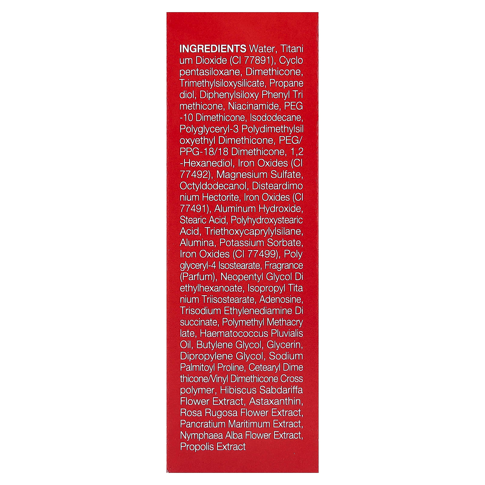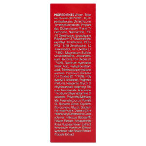 Água, dióxido de titânio (CI 77891), ciclopentasiloxano, dimeticona, trimethylsiloxysilicate, propanediol, diphenylsiloxy phenyl trimethicone, nicotinamida, peg -10 dimeticona, isododecane, polyglyceryl-3 polydimethylsiloxyethyl dimethicone, peg/ppg-18/18 dimeticona, 1,2-hexanediol, óxidos de ferro (CI 77492), sulfato de magnésio, octildodecanol, disteardimonium hectorite, óxidos de ferro (CI 77491), hidróxido de alumínio, ácido esteárico, ácido polihidroxiesteárico, triethoxycaprylylsilane, alumina, sorbato de potássio, óxidos de ferro (CI 77499), polyglyceryl-4 isostearate, fragrância, neopentyl glycol diethylhexanoate, isopropyl titanium triisostearate, adenosina, trisodium ethylenediamine disuccinate, polymethyl methacrylate, óleo de Haematococcus pluvialis, butilenoglicol, glicerina, dimetildietilenoglicol, prolina palmitoil sódio, crospolímero de cetoestearílico de dimeticona/vinil dimeticona, extrato da flor de Hibiscus sabdariffa, astaxantina, extrato da flor de Rosa rugosa, extrato de Pancratium maritimum, extrato da flor de Nymphaea alba, extrato de própolis.