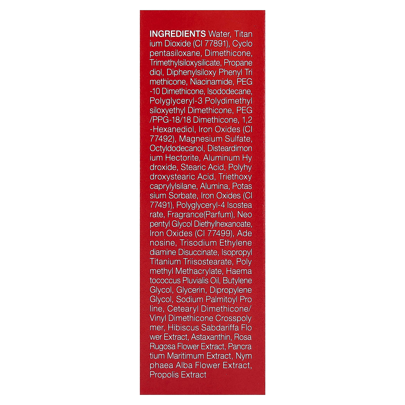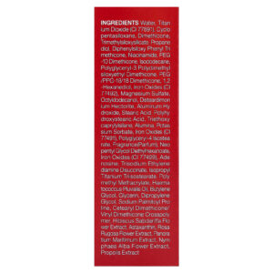 Água, dióxido de titânio (CI 77891), ciclopentasiloxano, dimeticona, trimethylsiloxysilicate, propano e diol, difenilsiloxi fenil trimeticona, nicotinamida, peg -10 dimeticona, isododecane, polyglyceryl-3 polydimethylsiloxyethyl dimethicone, peg/ppg-18/18 dimeticona, 1,2-hexanediol, óxidos de ferro (CI 77492), sulfato de magnésio, octildodecanol, disteardimonium hectorite, hidróxido de alumínio, ácido esteárico, ácido polihidroxiesteárico, triethoxycaprylylsilane, alumina, sorbato de potássio, óxidos de ferro (CI 77491), polyglyceryl-4 isostearate, fragrância (perfume), dietethylhexanoate de neo pentyl glycol, óxidos de ferro (CI 77499), adenosina, disuccinato de etileno diamina trissódica, isopropyl titanium triisostearate, metacrilato de polimetilo, óleo de Haematococcus pluvialis, butilenoglicol, glicerina, dimetildietilenoglicol, linha sodium palmitoyl pro, crospolímero de cetoestearílico/dimeticona de vinil, extrato da flor de Hibiscus sabdariffa, astaxantina, extrato da flor de Rosa rugosa, extrato de Pancra tium maritimum, extrato da flor de Nymphaea alba, extrato de própolis.