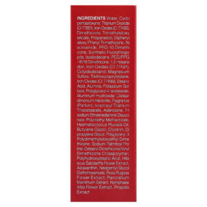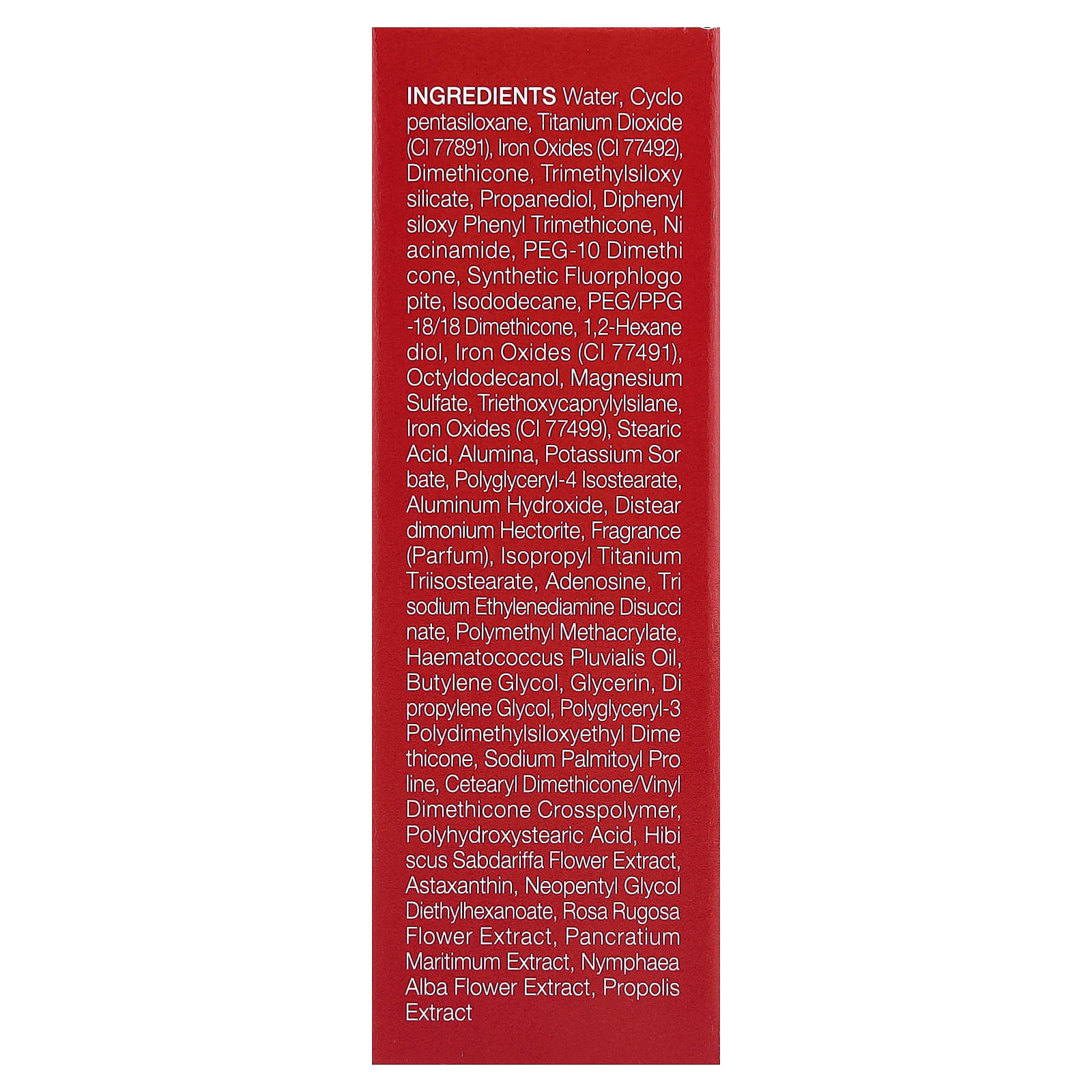 Água, ciclopentasiloxano, dióxido de titânio (CI 77891), óxidos de ferro (CI 77492), dimeticona, silicato de trimetilsiloxi, propanediol, diphenylsiloxy phenyl trimethicone, nicotinamida, peg-10 dimeticona, synthetic fluorphlogopite, isododecane, peg/ppg -18/18 de dimeticona, 1,2-hexanodiol, óxidos de ferro (CI 77491), octildodecanol, sulfato de magnésio, triethoxycaprylylsilane, óxidos de ferro (CI 77499), ácido esteárico, alumina, sorbate de potássio, polyglyceryl-4 isostearate, hidróxido de alumínio, disteardimonium hectorite, fragrância (perfume), isopropyl titanium triisostearate, adenosina, disuccinato de etilenodiamina trissódica, polymethyl methacrylate, óleo de Haematococcus pluvialis, butilenoglicol, glicerina, dipropilenoglicol, polyglyceryl-3 polydimethylsiloxyethyl dimethicone, prolina palmitoil sódio, crospolímero de cetoestearílico de dimeticona/vinil dimeticona, ácido polihidroxiesteárico, extrato da flor de Hibiscus sabdariffa, astaxantina, neopentyl glycol diethylhexanoate, extrato da flor de Rosa rugosa, extrato de Pancratium maritimum, extrato da flor de Nymphaea alba, extrato de própolis.