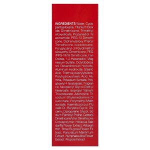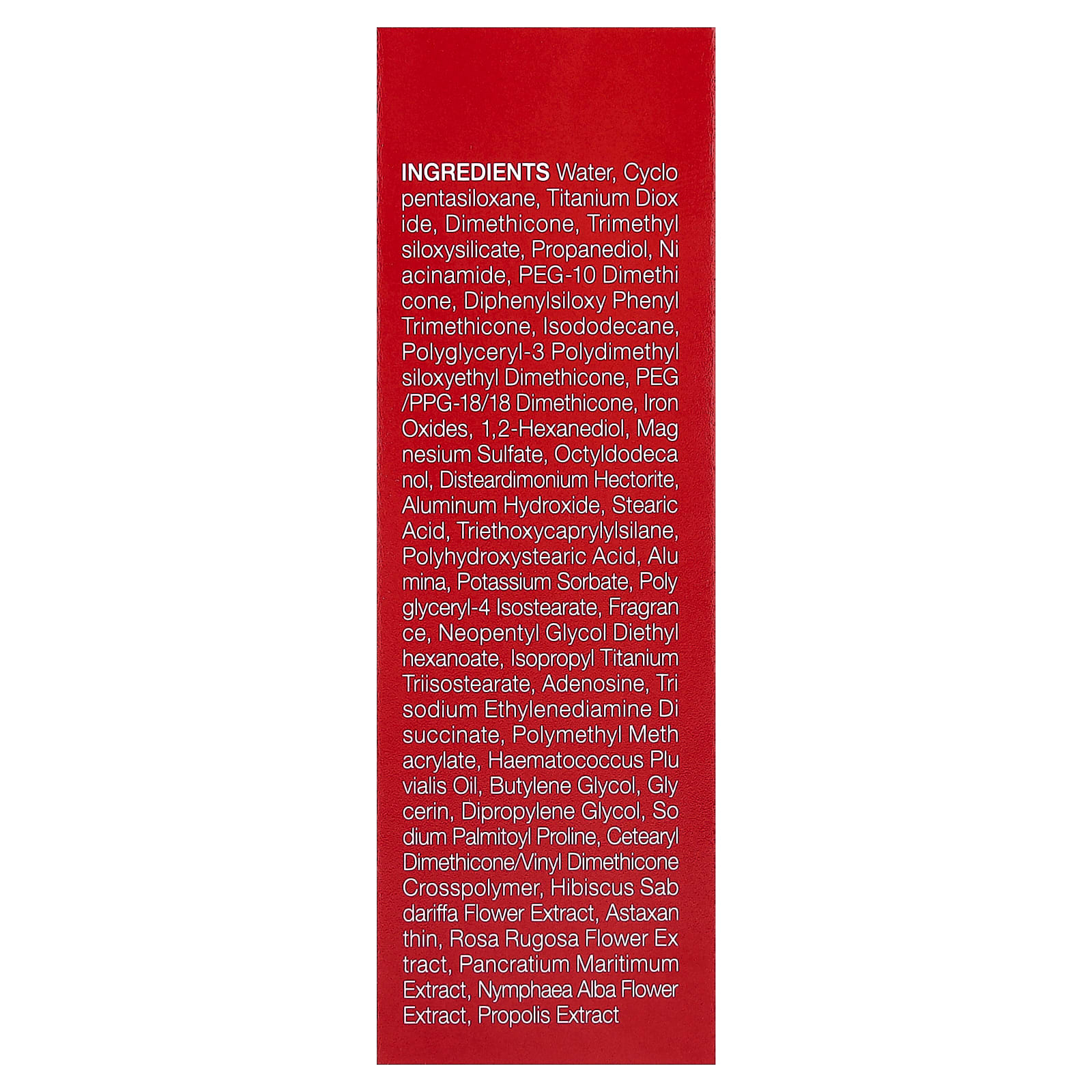 Água, decametilciclopentasiloxano, dióxido de titânio, dimeticona, trimethylsiloxysilicate, propanediol, nicotinamida, peg-10 dimeticona, diphenylsiloxy phenyl trimethicone, isododecane, polyglyceryl-3 polydimethylsiloxyethyl dimethicone, peg/ppg-18/18 dimeticona, óxidos de ferro, 1,2-hexanediol, sulfato de magnésio, octildodecanol, disteardimonium hectorite, hidróxido de alumínio, ácido esteárico, triethoxycaprylylsilane, ácido polihidroxiesteárico, alumina, sorbato de potássio, polyglyceryl-4 isostearate, fragrância, dietil hexanoato de neopentilglicol, isopropyl titanium triisostearate, adenosina, trisodium ethylenediamine disuccinate, polymethyl methacrylate, óleo de Haematococcus pluvialis, butilenoglicol, glicerina, dimetildietilenoglicol, prolina palmitoil sódio, crospolímero de cetoestearílico de dimeticona/vinil dimeticona, extrato da flor de Hibiscus sabdariffa, astaxantina, extrato da flor de Rosa rugosa, extrato de Pancratium maritimum, extrato da flor de Nymphaea alba, extrato de própolis.