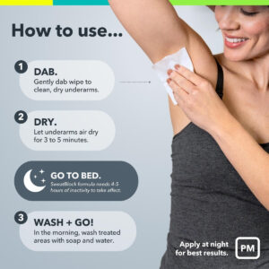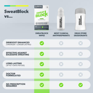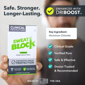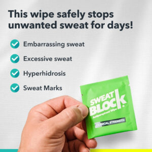Lenços antitranspirantes clínicos SweatBlock Max — Para transpiração excessiva e hiperidrose — Até 7 dias de proteção/lenço umedecido — 10 unidades — Unissex, sem perfume — CANSADO DE SUOR EMBARAÇOSO E INDESEJADO? – Use as roupas que você adora e fique confiante com lenços antitranspirantes nas axilas que bloqueiam o suor. Esses lenços contêm cloreto de alumínio puro verificado, o alumínio mais eficaz para impedir o suor excessivo. Também é eficaz como desodorante de força clínica. Forte prevenção anti-suor e odor para homens, mulheres e adolescentes. – PRESCRIÇÃO MÉDICA PARA TRATAMENTO DE HIPERIDROSE E SUOR EXCESSIVO – Nossos lenços antitranspirantes de força clínica testados pelo tempo são fortes o suficiente para hiperidrose, sudorese nervosa, sudorese hormonal e transpiração devido aos efeitos colaterais de medicamentos prescritos. Garantia de eliminar o suor indesejado. – RECUPERE SUA CONFIANÇA – Aproveite a vida sem se preocupar com o suor. Abrace, dê um abraço e levante os braços sem se preocupar. Obtenha resultados rápidos de parar o suor durante a noite com o antitranspirante SweatBlock. Nossos lenços também funcionam muito bem como um desodorante de força clínica para impedir o suor nas axilas e o odor nas axilas. – CRIADO POR UM MÉDICO. RECOMENDADO PELO MÉDICO – Nosso fundador, Dr. Steffensen, experimentou uma batalha em primeira mão contra a transpiração excessiva. Depois que desodorantes e antitranspirantes comprados em lojas falharam, ele criou a fórmula secreta SweatBlock para impedir o suor indesejado. Hoje, nossos lenços são testados clinicamente com ingredientes puros verificados e confiáveis em todo o mundo. O SweatBlock é seguro, forte e comprovado. Apresentado no The Rachael Ray Show e no The Today Show. – Sem testes em animais. Livre de parabenos, ftalatos, formaldeídos e sulfatos. Formulado, preenchido e selado nos EUA!