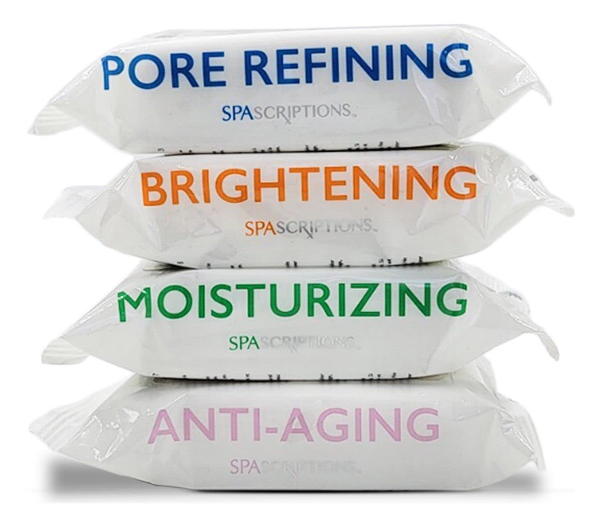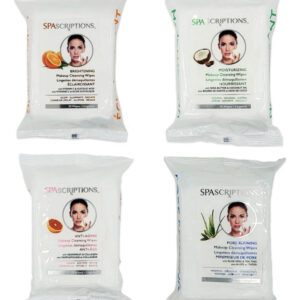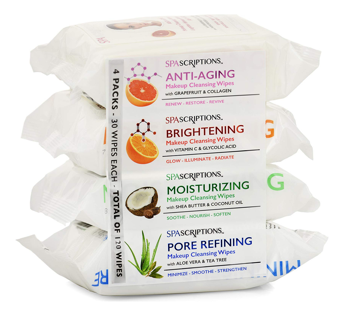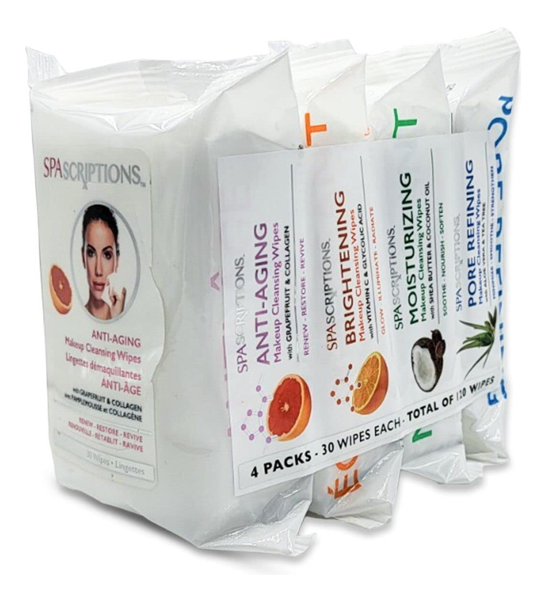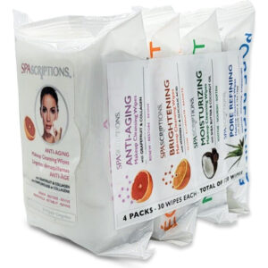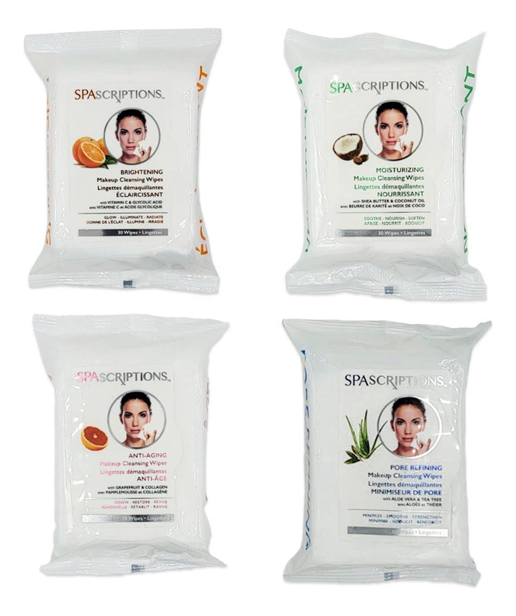 Toalhetes de limpeza de maquiagem SpaScriptions de 30 quilates, pacote com 4 variedades, 120 unidades no total — antienvelhecimento: o colágeno ajuda a renovar, apertar, dar volume e hidratar para uma pele mais lisa e firme. A toranja ajuda a melhorar a aparência de brilho e luminosidade da pele. – Iluminador: a vitamina C ajuda a clarear, esfoliar e iluminar a pele. O ácido glicólico ajuda a remover o acúmulo na superfície da pele para uma pele mais lisa e brilhante. – Hidratante: o óleo de coco restaura e nutre profundamente a pele com uma mistura de ácidos graxos e antioxidantes. A manteiga de karité oferece hidratação intensa à pele. – Refinação dos poros: a babosa ajuda a hidratar, refrescar e restaurar a elasticidade da pele. A árvore do chá, essencial para o controle do óleo, ajuda a limpar a pele propensa a acne.