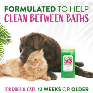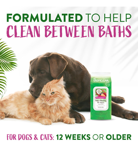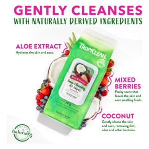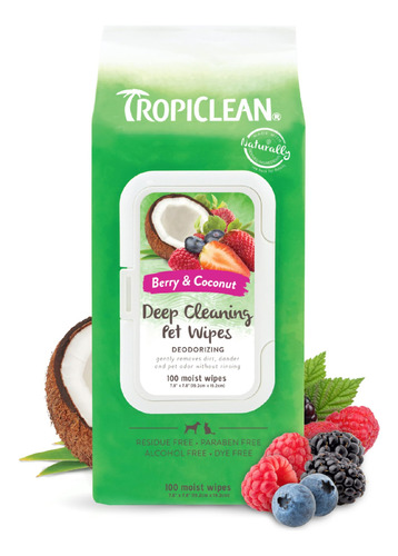 TropiClean Berry & Coconut Dog Wipes for Paws and Butt Deep Cleaning Dog Grooming Wipes Safe for The Face Cat Friendly 100 Count – ON-THE-GO WIPES TropiClean Berry & Coconut pet wipes provide a quick and easy clean-up for the face, paws, body and butt. – NEUTRALIZES SMELL Wipe away dirt, dander and smell with our long-lasting berry & coconut scented dog bath wipes. – FEEL-GOOD INGREDIENTS These convenient wipes for dogs are derived from natural ingredients that neutralize odor while moisturizing the skin and coat. – PET PARENT APPROVED Deep cleaning, yet gentle cat wipes are alcohol, dye, residue, paraben and cruelty free. Suitable for use on dogs and cats 12 weeks or older. – TROPICLEAN For a tropical experience, pair this with our Waterless Shampoo and Deodorizing Spray.