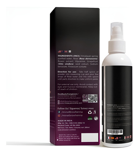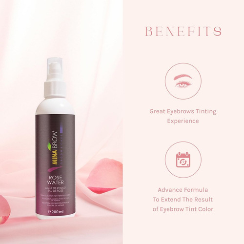 A Água de Rosas Mina prolonga a vida útil de sua tonalidade de sobrancelha de henna, garantindo um acabamento impecável e duradouro.