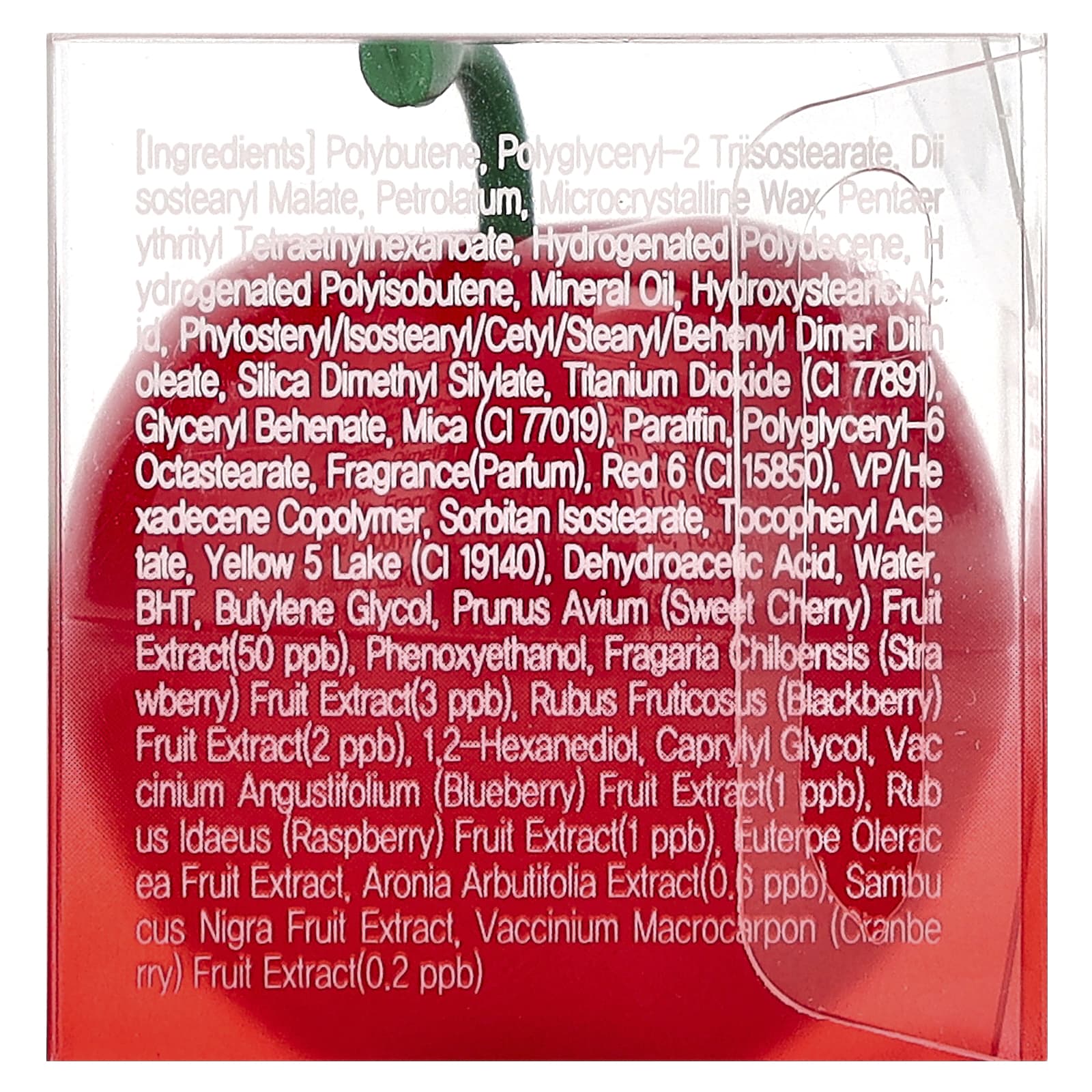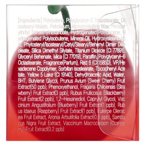 Polybutene, polyglyceryl-2 triisostearate, diisostearyl malate, petrolato, cera microcristalina, pentaerythrityl tetraethylhexanoate, hydrogenated polydecene, poliisobuteno hidrogenado, óleo mineral, ácido hidroxiesteárico, phytosteryl/isostearyl/cetyl/stearyl/behenyl dimer dilinoleate, silica dimethyl silylate, dióxido de titânio (CI 77891), beenato de glicerila, mica (CI 77019), parafina, octaestearato de poliglicerila-6, fragrância (perfume), vermelho rubi (CI 15850), copolímero de VP/hexadeceno, isoestearato de sorbitana, acetato de tocoferol, tartrazina laca de alumínio (CI 19140), dehydroacetic acid, água BHT, butilenoglicol, extrato da fruta de Prunus avium (cereja doce) (50 ppb), fenoxietanol, extrato da fruta de Fragaria chiloensis (morango) (3 ppb), Rubus fruticosus (extrato da fruta de amora (2 ppb), 1,2-hexanediol, caprylyl glycol, extrato da fruta de Vaccinium angustifolium (mirtilo) (1 ppb), extrato da fruta de Rubus idaeus (framboesa) (1 ppb), extrato do fruto de Euterpe oleracea, extrato de Arônia arbutifolia (0,6 ppb), extrato da fruta de Sambucus nigra, extrato da fruta de Vaccinium macrocarpon (cranberry) (0,2 ppb).