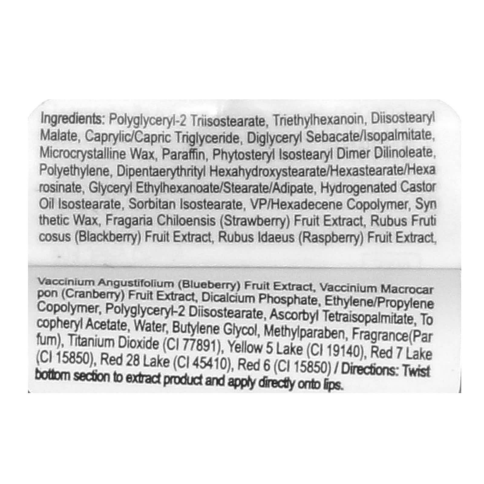 Poliglicerol-2, triisostearato, triethylhexanoin, diisostearyl isostearyl malate, caprylic/capric triglycerides, sebacato de glicerila d / isopalmitato, ozokerite, ceresina, dilinoleato de dímero de fitoestearila, polietileno, etilhexanoato / estearato / adipato de glicerila, dipentaerythrityl, hexa-hidroxiestearato / hexastearato, copolímero vp / hexadeceno, dióxido de titânio (CI 77891)*, isostearato de óleo de rícino hidrogenado, cera sintética, extrato de frutos silvestres, extrato de cranberry, extrato de morango, extrato de framboesa, extrato de mirtilo, extrato de amora, acetato de racealfatocoferol, fosfato de cálcio, isoestearato de sorbitana, copolímero de etileno / propileno, polyglyceryl-2 diisostearate, palmitato de ascorbila, água purificada, butylene glycol, metil parabeno, fenoxietanol, butilparabeno, butilparabeno, etilparabeno, isobutil parabeno, fragrância, alimento vermelho no.202 (CI 15850: 1), alimento vermelho no.201 (CI 15850), violeta de magnésio (CI 77742).