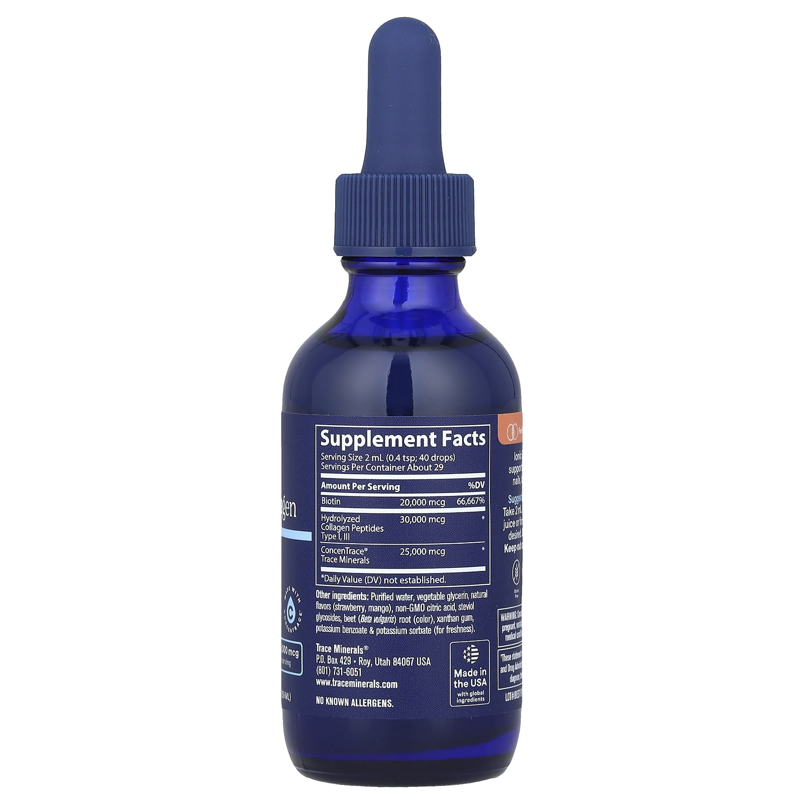 Trace Biotina Iônica + Colágeno Morango e Manga 75.000 mcg 59 ml (2 fl oz) – Trace Suplementos Cabelos, Pele e Unhas Vitamina B7 (Biotina) Ossos, Articulações e Cartilagem Colágeno, Suplementos.