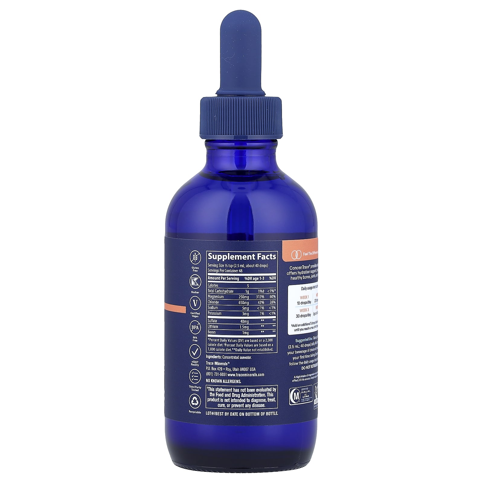 Tomar até 1/2 colher de chá (2,5 ml; 40 gotas) diariamente. Misture as gotas na bebida de sua escolha na hora das refeições. Se for a primeira vez que você toma ConcenTrace®, siga as instruções de uso diário acima.
