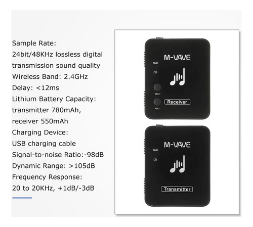 Banda de transmissão sem fio de 2,4 GHz, taxa de amostragem de 24 bits/48 kHz. Distância de