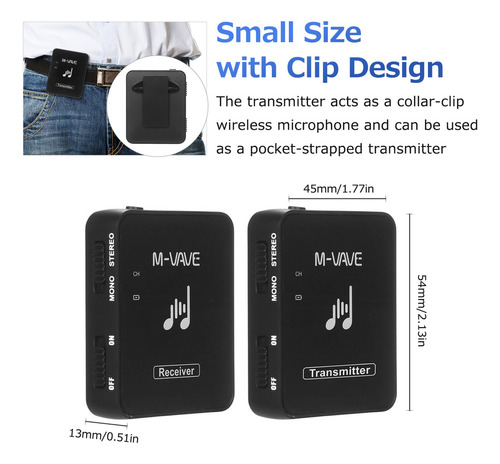 5 conjuntos de equipamentos podem funcionar ao mesmo tempo. O transmissor atua como um microfone sem fio com clipe de colar e pode ser usado como um transmissor com alça de bolso