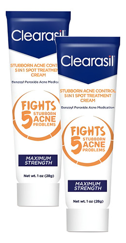 Creme de controle de acne Clearasil 5 em 1 de força máxima com peróxido de benzoíla, 28 ml (1 oz) combate poros entupidos, tamanho de espinhas, excesso de oleosidade, cicatrizes de acne e cravos (pacote com 2) O