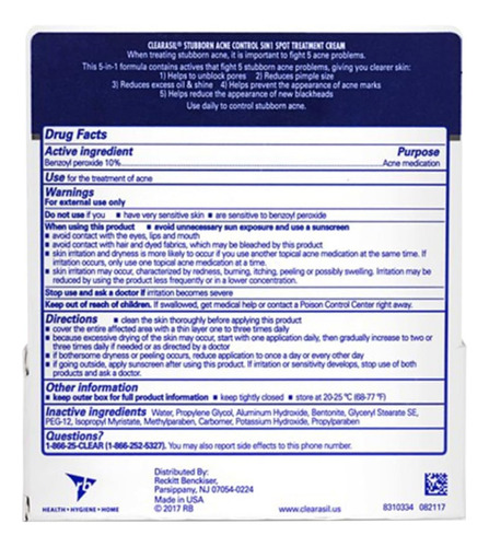 creme de tratamento local 5 em 1 Clearasil é a solução completa para combater os cinco sinais persistentes de acne, proporcionando uma pele visivelmente mais clara. Este creme ajuda a desobstruir os poros, reduzir o tamanho das espinhas, controlar o excesso de oleosidade, atenuar as cicatrizes da acne e eliminar cravos para uma pele clara e saudável. Formulado com peróxido de benzoíla, um medicamento eficaz para acne, o Clearasil tem como alvo as manchas existentes e evita a formação de novas. Sua ação profunda limpa da superfície ao interior dos poros, fornecendo tratamento de força máxima por 24 horas para que você possa viver sem preocupações hoje e amanhã. Ideal para o tratamento da acne, é recomendável aplicar uma camada fina na área afetada uma vez ao dia, aumentando gradualmente para duas ou três aplicações conforme necessário ou conforme orientação de um médico. Não use em peles muito sensíveis ou se você é alérgico ao peróxido de benzoíla. Evite exposição solar desnecessária e use protetor solar; evite contato com olhos, lábios e boca.