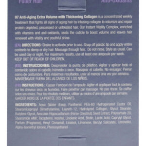 Combata os sinais de envelhecimento e recupere seus cabelos jovens, saltitantes e volumosos com este tratamento. Este tratamento enriquecido com vitaminas infunde colágeno para dar volume aos cabelos sem proteína, processados quimicamente ou não tratados, deixando o cabelo renovado.