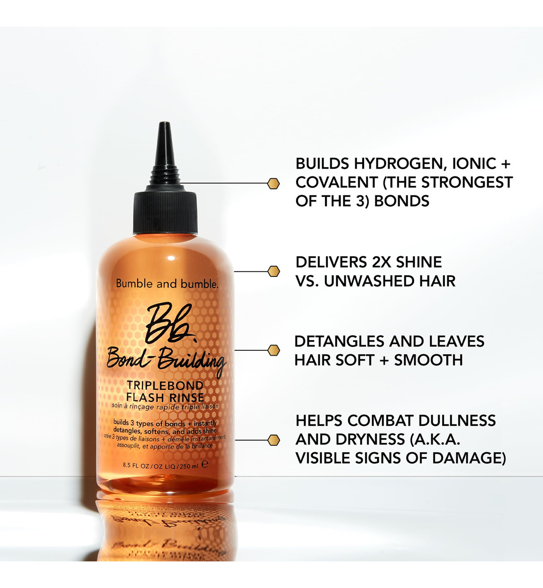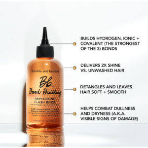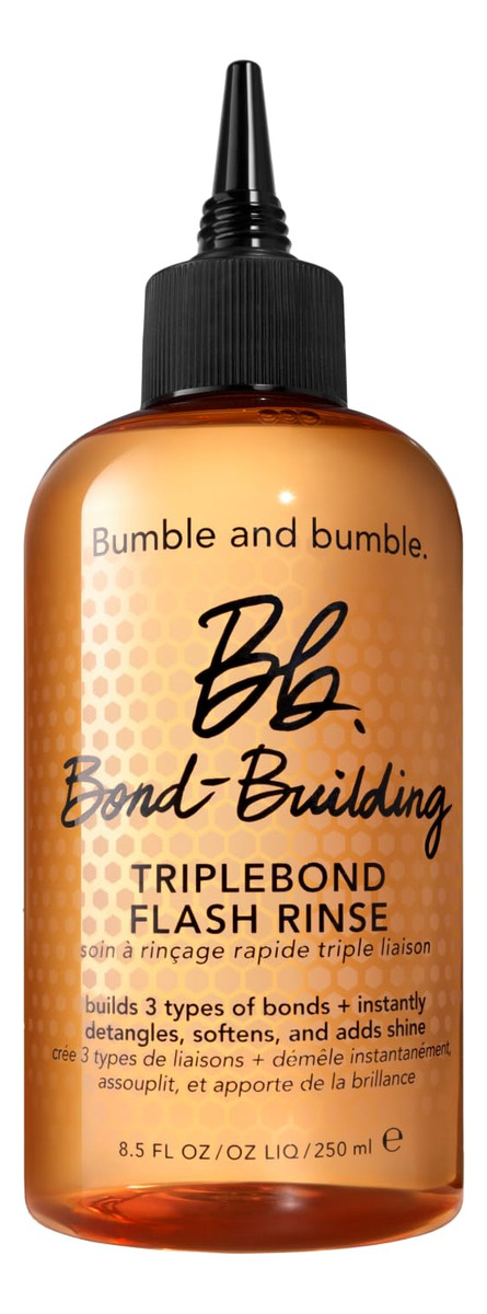 Bumble and bumble. Enxágue instantâneo TripleBond Flash Building para cabelos danificados, 8,5 fl oz – Tratamento instantâneo de cabelo que cria 3 tipos de aderência para fortalecer e dar brilho. – Resultados instantâneos Constrói os 3 tipos essenciais de união 2x brilho* *versus cabelos não lavados – Ideal para cabelos danificados. – Alimentado por nosso complexo Honey Bond-Building TripleBond, que cria três tipos de ligações (hidrogênio, iônico e covalente) no córtex fortifica o cabelo de dentro para fora. A tecnologia de condicionamento micelar atrai e remove as impurezas enquanto condiciona e dá brilho. – Um toque sorridente de frutas cítricas, florais e madeiras revive os sentidos enquanto você cria laços para ajudar a fortalecer.