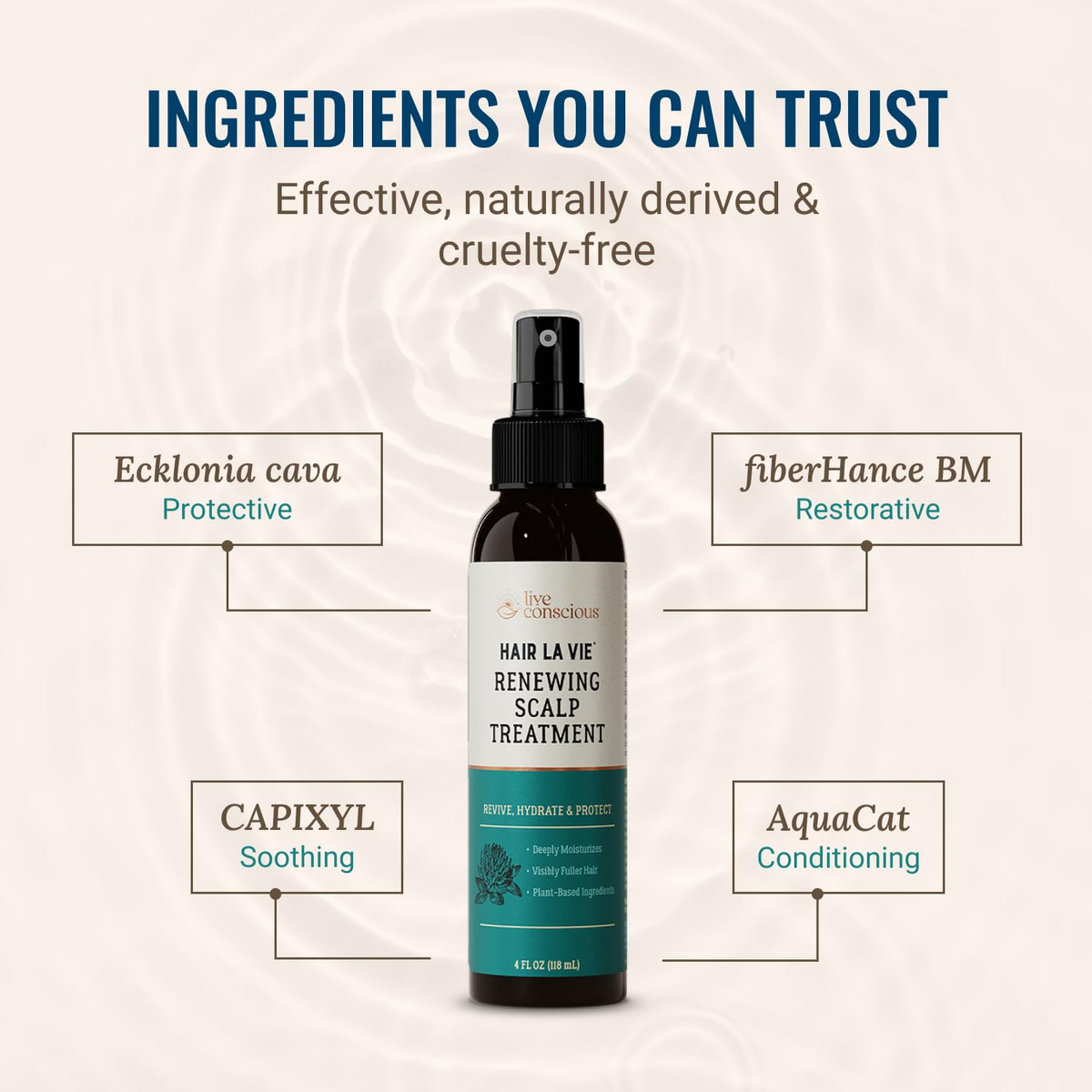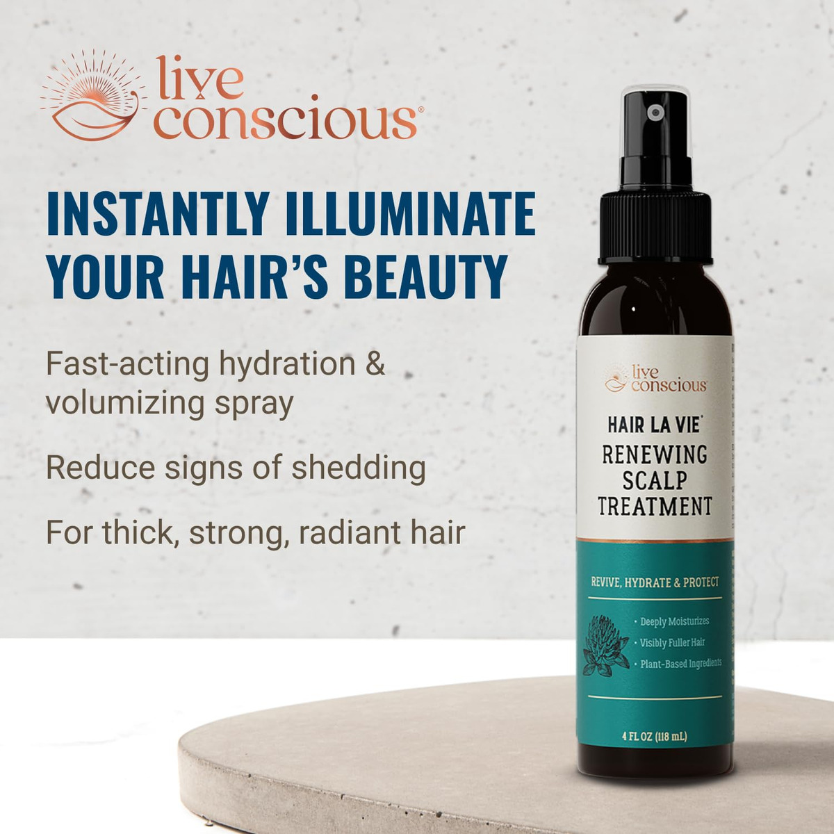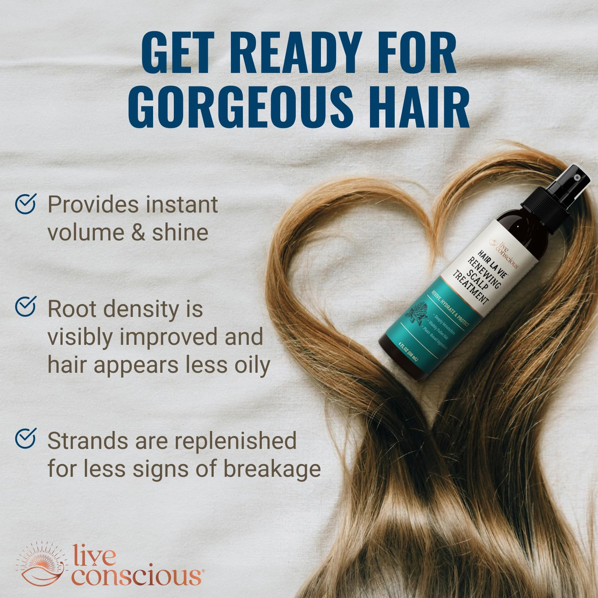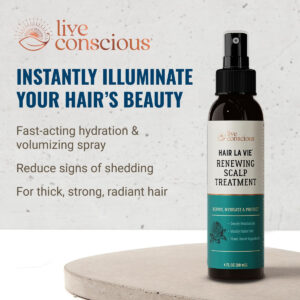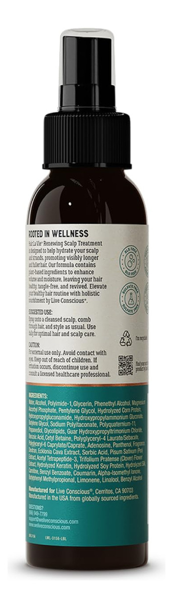 O Hair La Vie Renewing Scalp Treatment foi desenvolvido para ajudar a hidratar o couro cabeludo e os fios, promovendo cabelos visivelmente mais longos e cheios. Nossa fórmula contém ingredientes vegetais para aumentar o volume e a umidade, deixando seu cabelo saudável, sem emaranhados e revigorado. Eleve sua rotina de cabelo saudável com nutrição holística da Live Conscious. – TRATAMENTO CAPILAR PARA MULHERES – O tratamento renovador do couro cabeludo Hair La Vie da Live Conscious oferece nutrição rápida para cabelos visivelmente mais fortes e cheios, para apoiar visivelmente a plenitude do cabelo e reduzir a oleosidade. Instantaneamente, o cabelo fica lindamente volumizado, hidratado e sem emaranhados. Apenas algumas borrifadas diárias de nosso tratamento para o couro cabeludo podem melhorar a aparência da densidade e plenitude do cabelo – O SPRAY VOLUMIZANTE FORTALECE O CABELO DEIXA O CABELO MAIS ESPESSO E CHEIO – Com uma mistura holística de 6 ingredientes ativos, incluindo Ecklonia cava, Capauxeína G2, CAPIXYL, FiberHance BM, Procatalina Biofuncional e AquaCat, além de antioxidantes que ajudam a restaurar e rejuvenescer a queratina A atina se une ao fio de cabelo para fortalecer a estrutura do cabelo, proporcionando visivelmente mais plenitude e menos quebras. – VISÍVEL MELHORA A DENSIDADE DO CABELO E REDUZ OS SINAIS DE QUEDA – Hair La O Vie Renewing Scalp Treatment da Live Conscious atua sobre todos os fatores que influenciam os sinais de saúde do cabelo, como plenitude, força e hidratação do couro cabeludo. Quando usado diariamente, pode combater os efeitos visíveis do estresse ambiental e reduzir os sinais de queda, quebra e danos causados pelo estresse oxidativo diário. – ACALMA INSTANTANEAMENTE O COURO CABELUDO E REMOVE O EXCESSO DE OLEOSIDADE – Ajuda a reduzir o excesso de óleo e gordura, melhora a hidratação do couro cabeludo, alivia o couro cabeludo seco e a coceira e promove um ambiente saudável para cabelos mais fortes e volumosos. Quando usado diariamente, esse tratamento leve pode ser uma solução de longo prazo para manter cabelos visivelmente espessos, fortes e saudáveis. – MESMA FÓRMULA, NOVA LOCALIZAÇÃO Ofereça nutrição diária e volume instantâneo ao cabelo com o tratamento Renewing Scalp da Live Conscious. Aplique diretamente no couro cabeludo limpo, penteie e modele como de costume. Use uma vez ao dia para manter o cabelo hidratado e com aparência mais cheia, com facilidade de desembaraçar. Este spray volumizante funciona em todas as texturas do cabelo e melhora visivelmente a densidade do cabelo enquanto reduz os sinais de queda de cabelo. Para obter melhores resultados, combine-o com nossas vitaminas para cabelo Hair La Vie Clinical Formula para melhorar a saúde do cabelo de dentro para fora. *