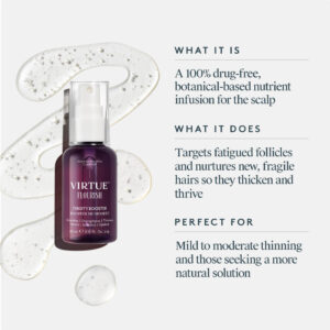 Virtue Flourish Density Booster é um spray de tratamento noturno clinicamente comprovado para apoiar o crescimento de novos cabelos. Esta infusão 100% livre de medicamentos de vegetais, nutrientes e proteína de queratina exclusiva da Virtues foi projetada especificamente para ajudar você a crescer um cabelo mais forte, mais espesso e saudável a cada uso. Borrife o Flourish Density Booster diretamente no couro cabeludo todas as noites, onde a queda e a queda de cabelo são mais proeminentes, e veja o cabelo começar a crescer um pouco mais a cada manhã. – Ideal para quem sofre de queda e/ou queda de cabelo – Um spray leve e de rápida absorção que não deixa resíduos – Infunde nos folículos vitaminas ricas em nutrientes, antioxidantes e nossa mistura exclusiva de proteínas para apoiar um novo crescimento para que o cabelo possa engrossar e prosperar – Seguro para cabelos tratados com cores e quimicamente tratados. – Sem silicone, sem sulfato, sem parabenos, sem glúten e sem glúten de ftalatos, corantes e corantes sintéticos; Vegano