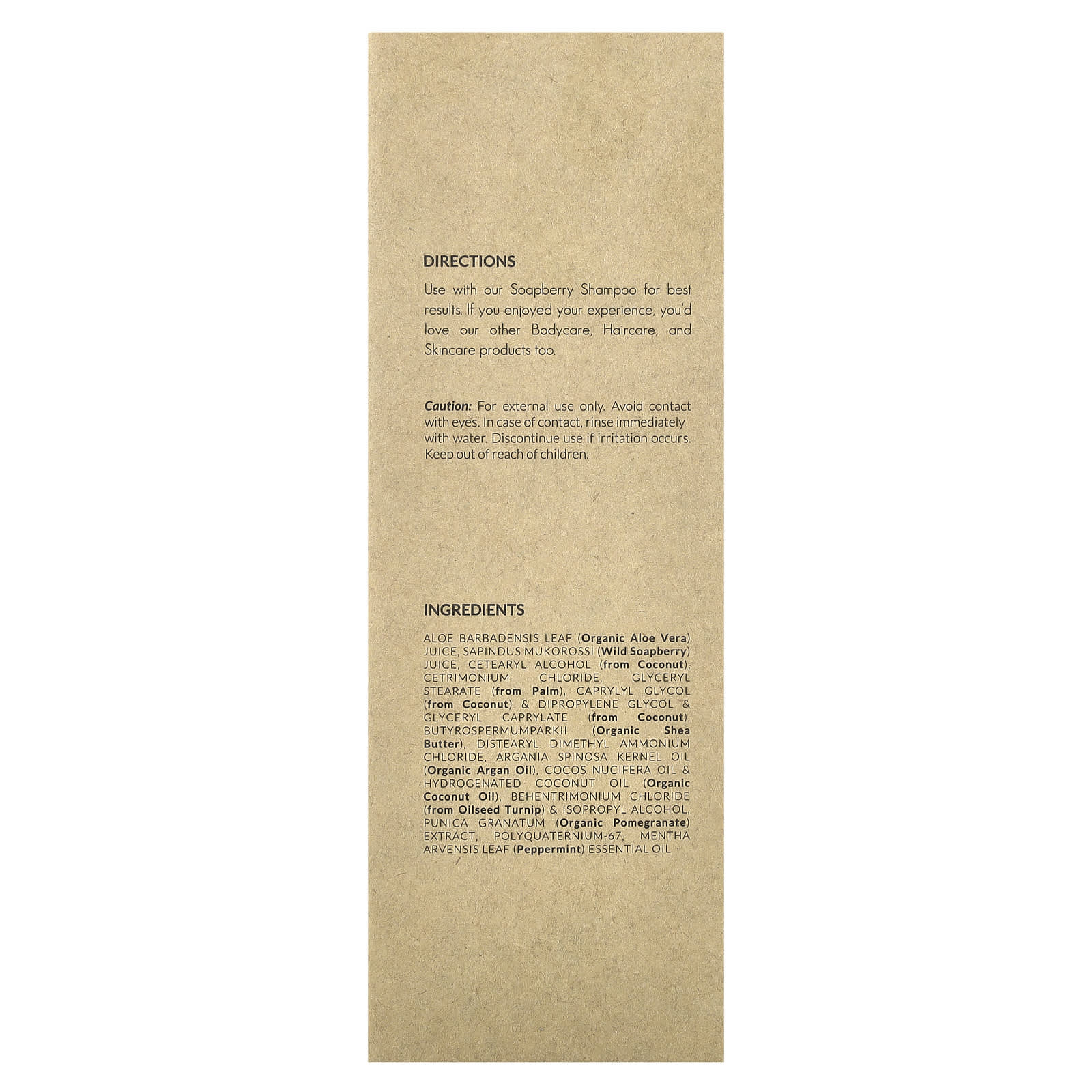 Suco da folha de Aloe barbadensis (babosa orgânica), suco de Sapindus mukorossi (sapindus selvagem), álcool cetoestearílico (derivado de coco), cetrimonium chloride, monoestearato de glicerila (derivado de palma), caprylyl glycol (de coco) & dipropilenoglicol e & glyceryl caprylate (derivado de coco), butyrospermum parkii (manteiga de karité orgânica), cloreto de diestearil dimetil amônio, óleo do grão de Argania spinosa (óleo de argão orgânico), óleo de Cocos nucifera e óleo de Cocos nucifera; óleo de coco hidrogenado (óleo de coco orgânico), behentrimonium chloride (de nabo oleaginoso) & álcool isopropílico, extrato de Punica granatum (romã orgânica), poliquatérnio-67, óleo essencial da folha de Mentha arvensis (hortelã-pimenta).