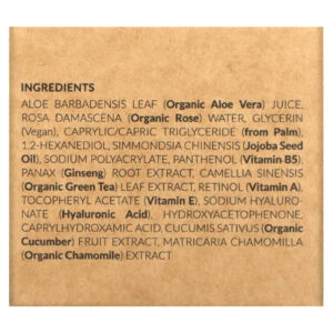 suco da folha de Aloe barbadensis (babosa) orgânica., água de Rosa damascena (rosa orgânica), glicerina (vegana), triglicerídeo caprílico / cáprico (da palma da mão), 1,2-hexanediol, simmondsia chinensis (óleo da semente de jojoba), poliacrilato de sódio, pantenol (vitamina B5), extrato da raiz de Panax (ginseng), extrato da folha de Camellia sinensis (chá verde orgânico), retinol (vitamina A), acetato de racealfatocoferol (vitamina E), hialuronato de sódio (ácido hialurônico), hydroxyacetophenone, caprylhydroxamic acid, extrato do fruto de Cucumis sativus (pepino), extrato de matricária camomila (camomila orgânica).