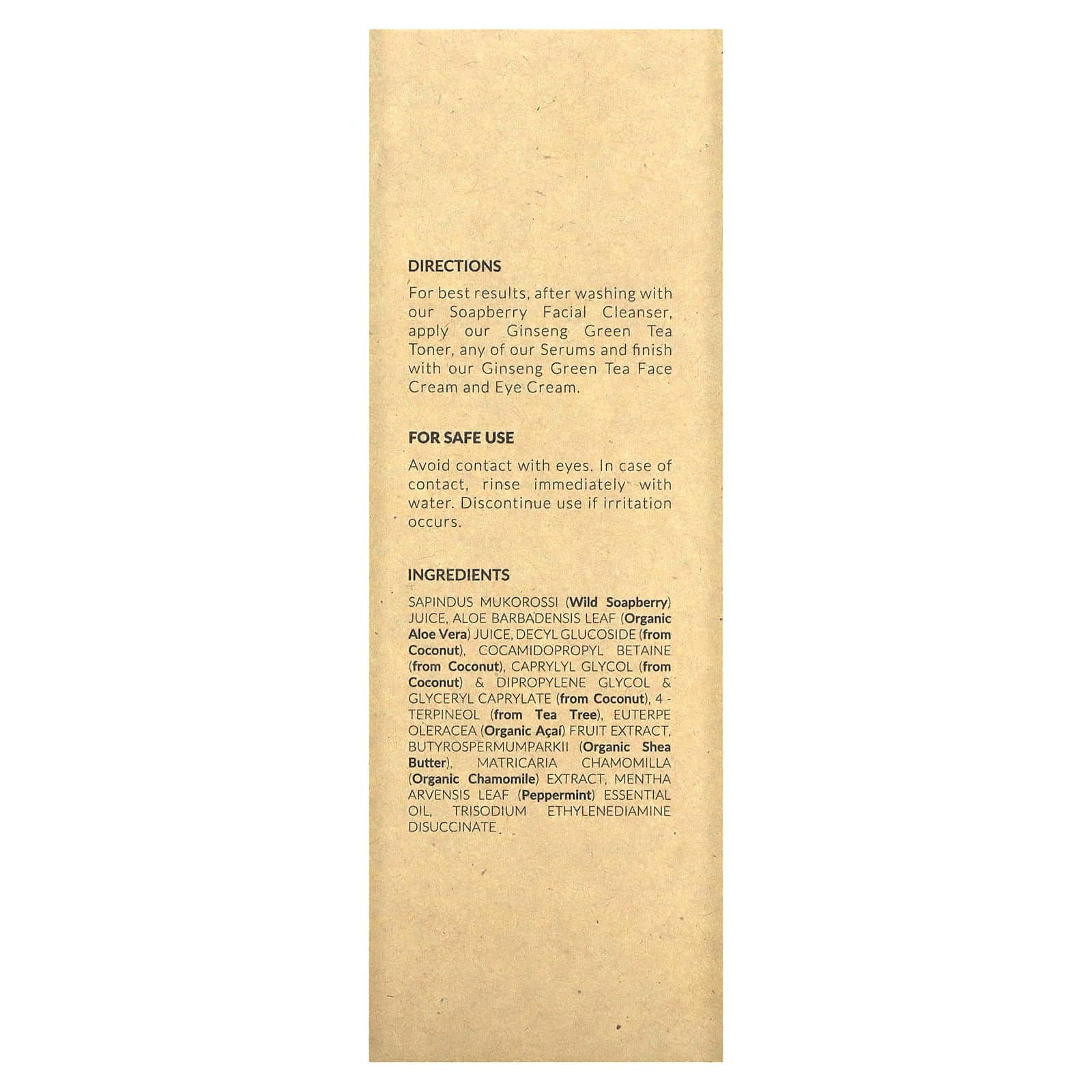 Suco de Sapindus mukorossi (saboneteira silvestre), suco da folha de Aloe barbadensis (babosa orgânica), decyl glucoside (derivado de coco), cocoamidopropil betaína (de coco), caprilglicol (de coco) & amp; dipropilenoglicol e amp; gliceril caprilato (de coco), 4-terpineol (da árvore do chá), extrato da fruta de Euterpe oleracea (açaí orgânico), Butyrospermum parkii (manteiga de karité orgânica), extrato de matricária camomila (camomila orgânica), óleo essencial de folha de Mentha arvensis (hortelã-pimenta), etilenodiamina disuccinato trissódico.