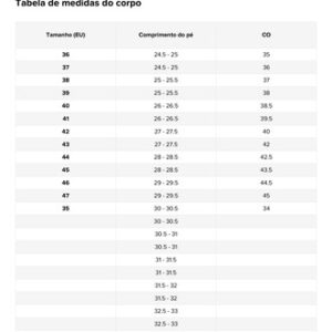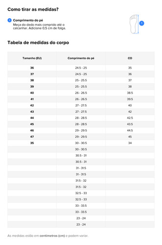 para tamanhos Referência: comprimento do pé não significa comprimento da palmilha.