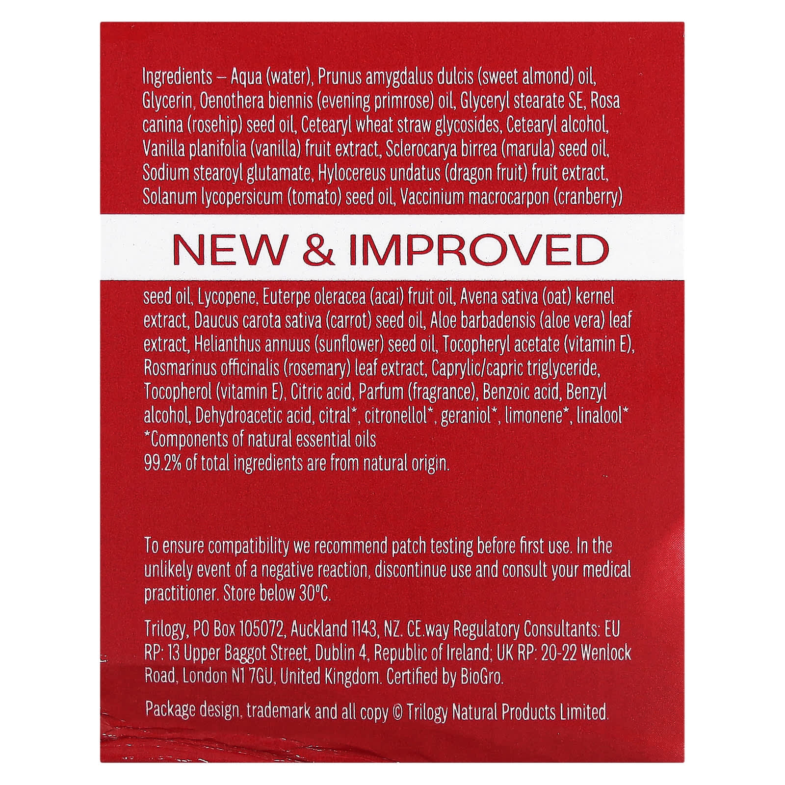 Aqua (água), óleo de Prunus amygdalus dulcis (amêndoa doce), glicerina, óleo de Oenothera biennis (prímula), monoestearato de glicerila autoemulsionável, óleo da semente de Rosa canina (rosa mosqueta), glicosídeos de canudo de trigo cetoestearílico, álcool cetoestearílico, extrato da fruta de Vanilla planifolia (baunilha), óleo da semente de Sclerocarya birrea (marula), sodium stearoyl glutamate, extrato da fruta de Hylocereus undatus (pitaia), óleo da semente de Solanum lycopersicum (tomate), óleo da semente de Vaccinium macrocarpon (cranberry), licopeno, óleo da fruta Euterpe oleracea (açaí), extrato de Avena sativa (aveia), óleo da semente de Daucus carota sativa (cenoura), extrato da folha de Aloe barbadensis (babosa), óleo da semente de Helianthus annuus (girassol), acetato de tocoferol (vitamina E), extrato da folha de Rosmarinus officinalis (alecrim), caprylic/capric triglyceride, tocoferol (vitamina E), ácido cítrico, perfume (fragrância), ácido benzoico, álcool benzílico, dehydroacetic acid, citral*, citronelol*, geraniol*, limoneno *, linalol*.
