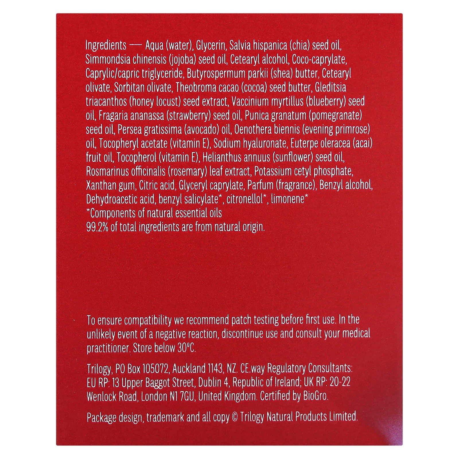 Aqua (água), glicerina, óleo da semente de Salvia hispanica (chia), óleo da semente de Simmondsia chinensis (jojoba), álcool cetoestearílico, coco-caprylate, caprylic/capric triglyceride, manteiga de Butyrospermum parkii (karité), cetearyl olivate, sorbitan olivate, manteiga da semente de Theobroma cacao (cacau), extrato da semente de Glidetsia tricanthos (gafanhoto), óleo da semente de Vaccinium myrtillus (mirtilo), óleo da semente de Fragaria ananassa (morango), óleo da semente de Punica granatum (romã), óleo de Persea gratissima (abacate), óleo de Oenothera biennis (prímula), acetato de tocoferol (vitamina E), hialuronato de sódio, óleo da fruta Euterpe oleracea (açaí), tocoferol (vitamina E), óleo da semente de Helianthus annuus (girassol), extrato da folha de Rosmarinus officinalis (alecrim), fosfato cetílico de potássio, goma xantana, ácido cítrico, caprilato de glicerila, perfume (fragrância), álcool benzílico, dehydroacetic acid, salicilato de benzila*, citronelol*, limoneno*.