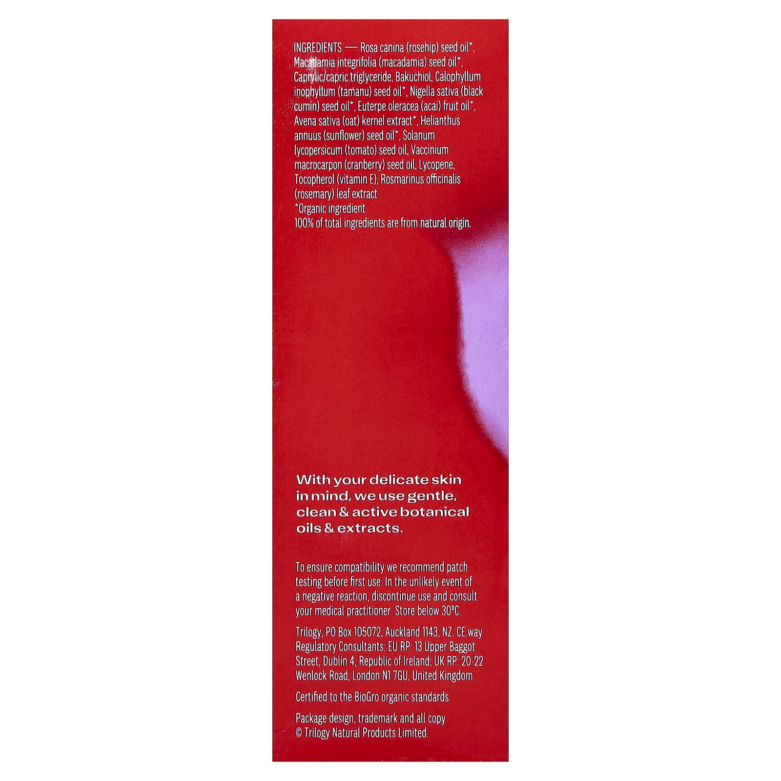 Óleo da semente de Rosa canina (rosa-mosqueta)*, óleo da semente de macadâmia integrifolia (macadâmia) *, caprylic/capric triglyceride, bakuchiol, óleo da semente de calophyllum inophyllum (tamanu) *, óleo da semente de Nigella sativa (cominho preto)*, óleo da fruta de Euterpe oleracea (açaí) *, extrato do grão de avena sativa (aveia) *, óleo da semente de Helianthus annuus (girassol)*, óleo da semente de Solanum lycopersicum (tomate), óleo da semente de Vaccinium macrocarpon (cranberry), licopeno, tocoferol (vitamina E), extrato da folha de Rosmarinus officinalis (alecrim).