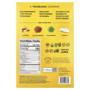 Mistura de fibra de tapioca e mandioca, mistura de proteínas à base de plantas (proteína de arroz integral de grãos integrais, proteína de ervilha orgânica), amêndoas, açúcar de cana orgânico, óleo de palma rspo, cacau em pó de comércio justo, sal marinho, lecitina de girassol.