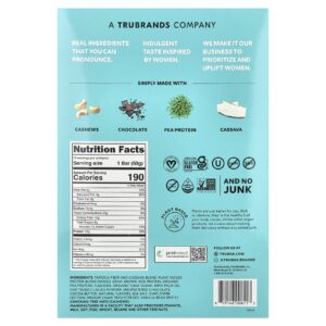 Mistura de fibra de tapioca e mandioca, mistura de proteínas à base de plantas (proteína de arroz integral de grãos integrais, proteína de ervilha orgânica), cajus, açúcar de cana orgânico, óleo de palma rspo, cacau em pó de comércio justo, chocolate não adoçado, manteiga de cacau, sabores naturais, sal marinho, lecitina de girassol, triglicerídeo de cadeia média, manchas da fava de baunilha.